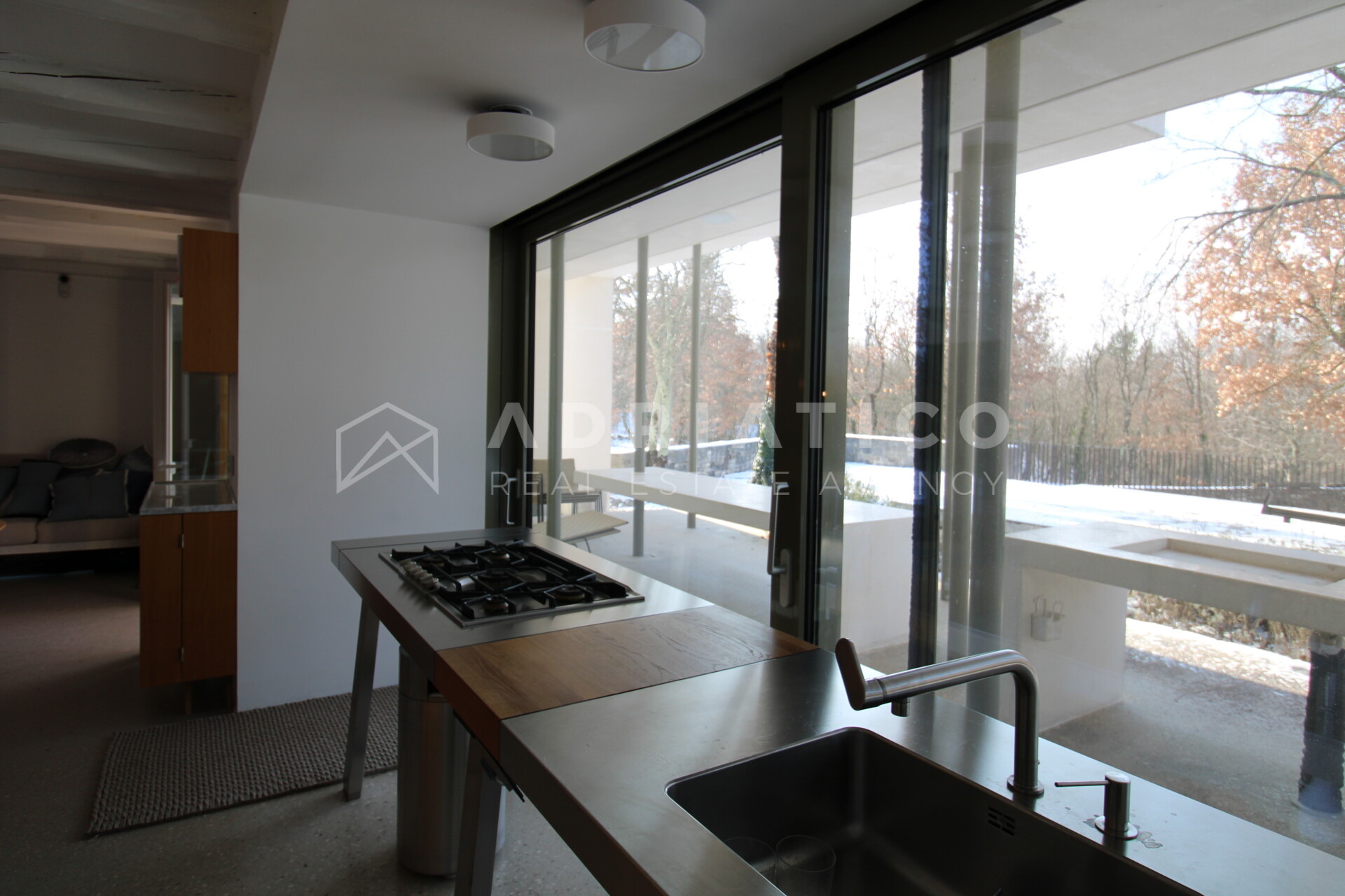 Der helle Wohnbereich vereint Wohnzimmer, Essbereich und eine moderne, hochwertig ausgestattete Küche. Vom Essbereich gelangt man auf eine Terrasse mit Pool. Im Erdgeschoss befinden sich zudem ein Schlafzimmer, ein Badezimmer und ein Hauswirtschaftsraum.