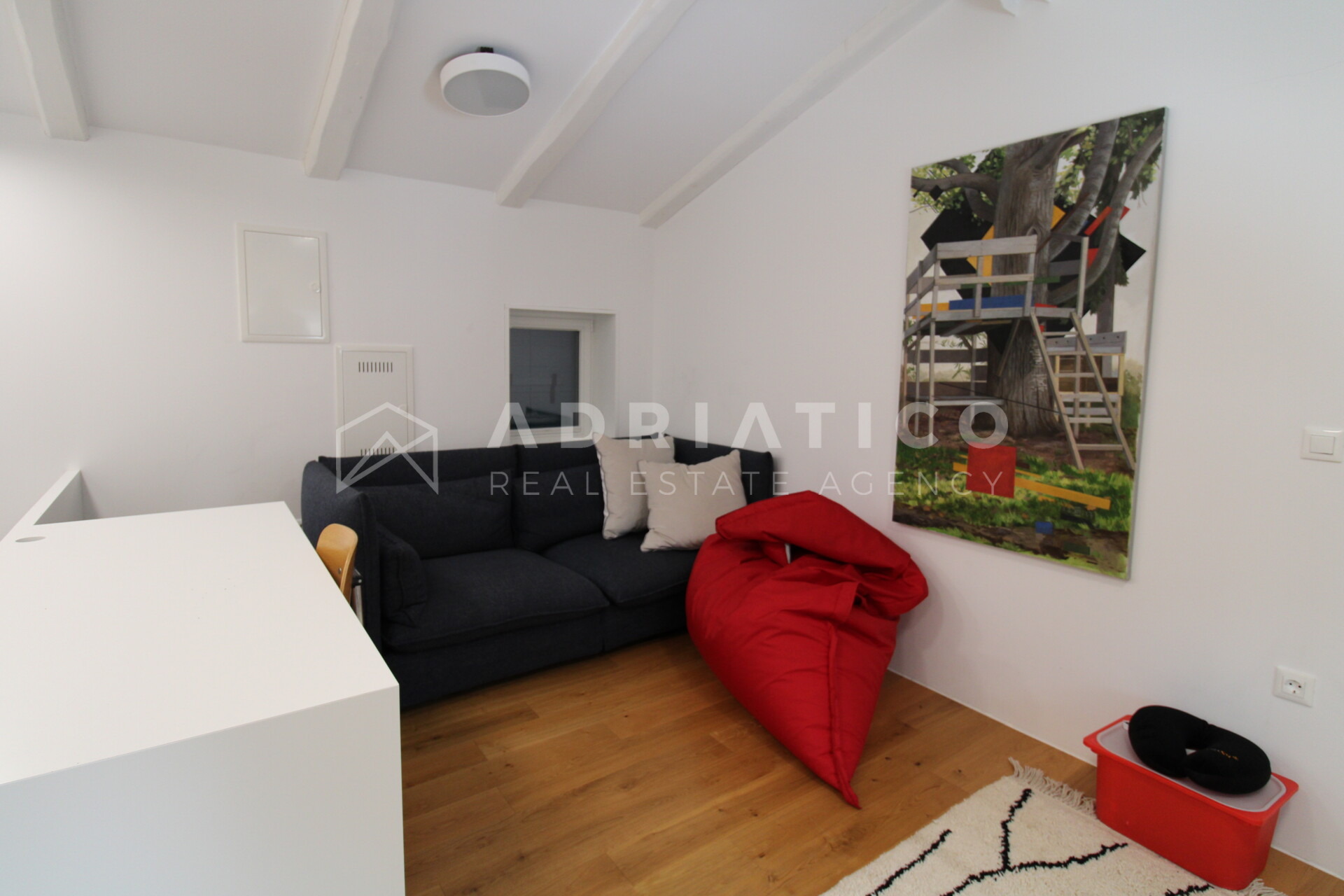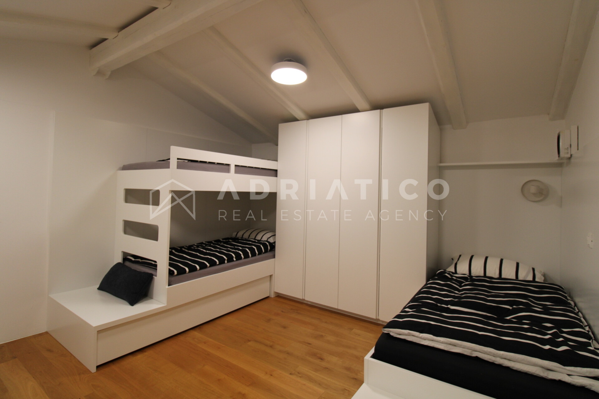 Im Obergeschoss liegen zwei Schlafzimmer, ein Badezimmer sowie ein kleiner Wohnbereich.