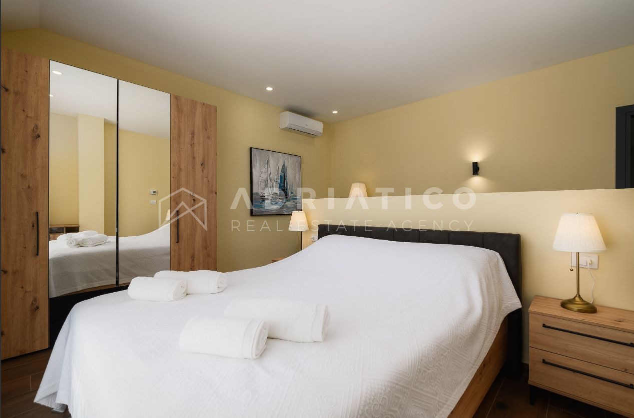 Im ersten Stock dieser geräumigen Villa finden wir ein geräumiges Schlafzimmer mit einem luxuriösen Badezimmer und einer überdachten Terrasse mit Blick auf die Umgebung und das Meer.