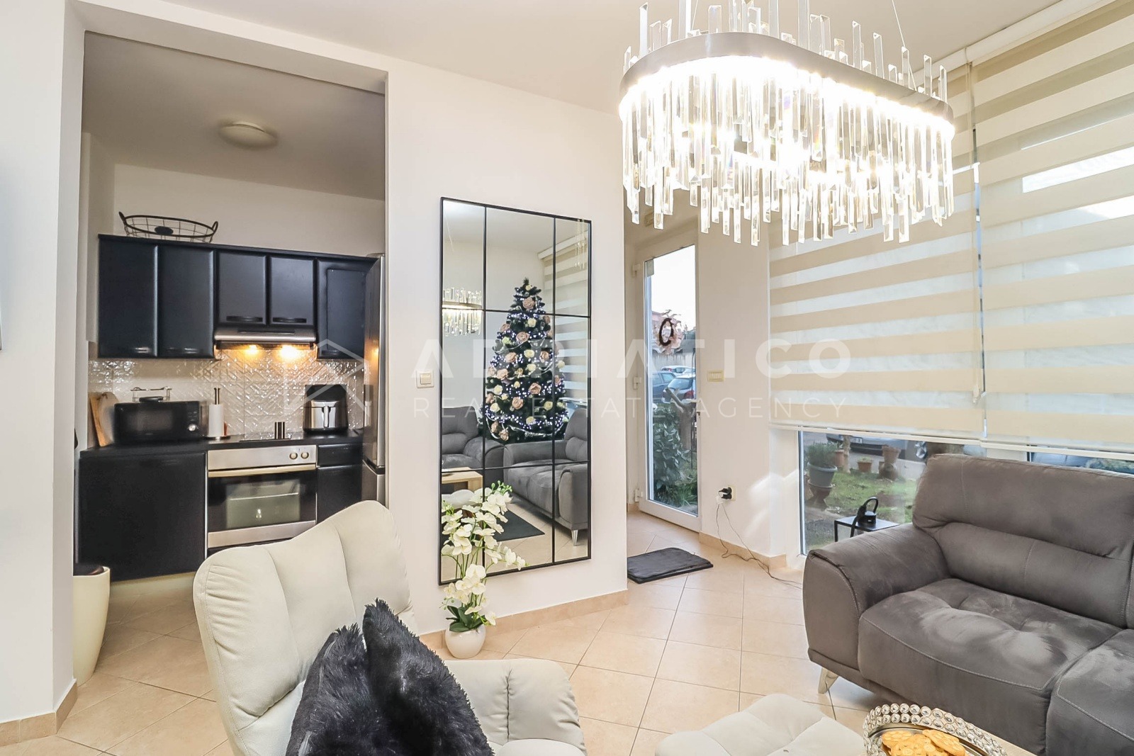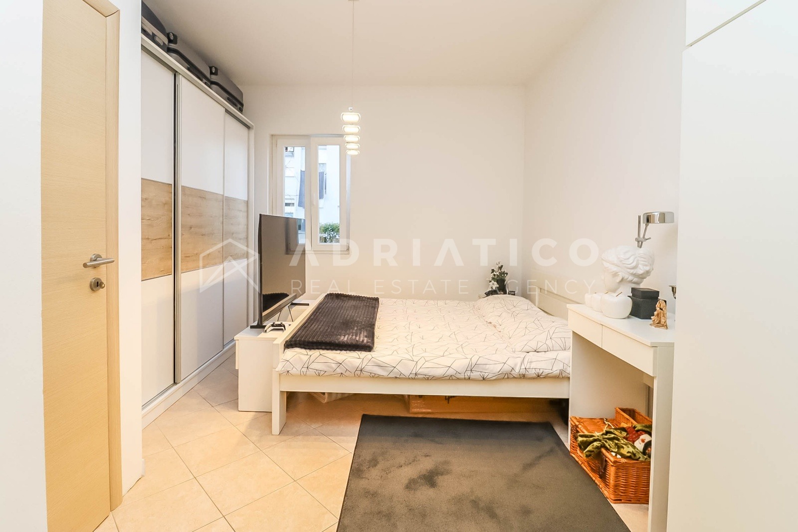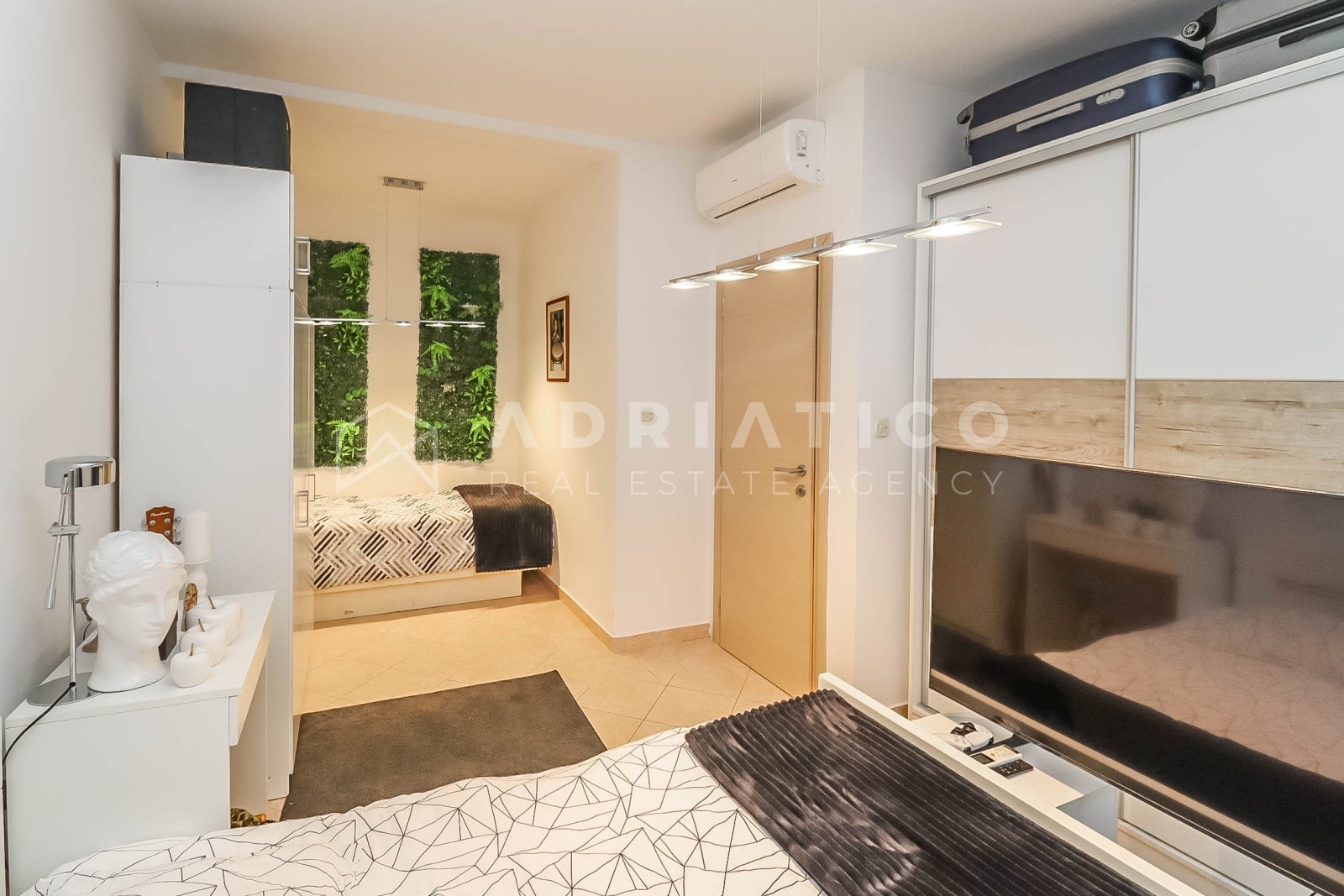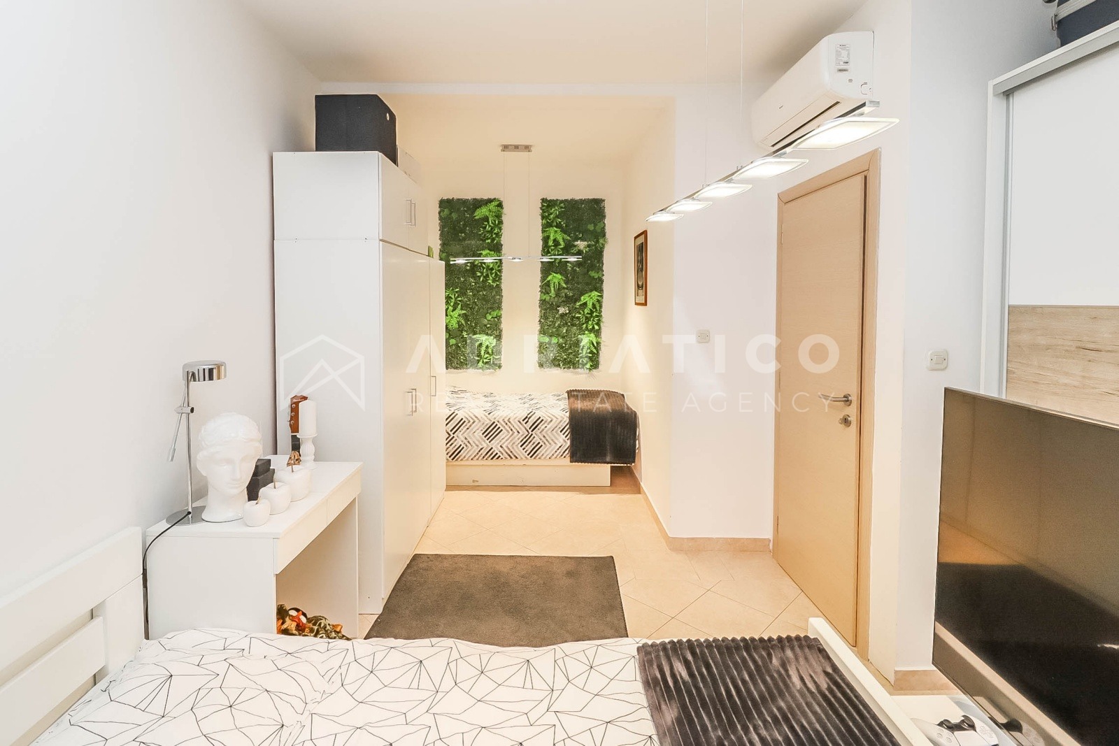 Die Wohnung ist in einem modernen und eleganten Stil gestaltet, mit neutralen Farbtönen, hochwertiger Beleuchtung und einer funktionalen Raumaufteilung, die eine optimale Nutzung der Fläche ermöglicht. Das Wohnzimmer ist hell und gemütlich, während das Schlafzimmer Ruhe und Erholung bietet.