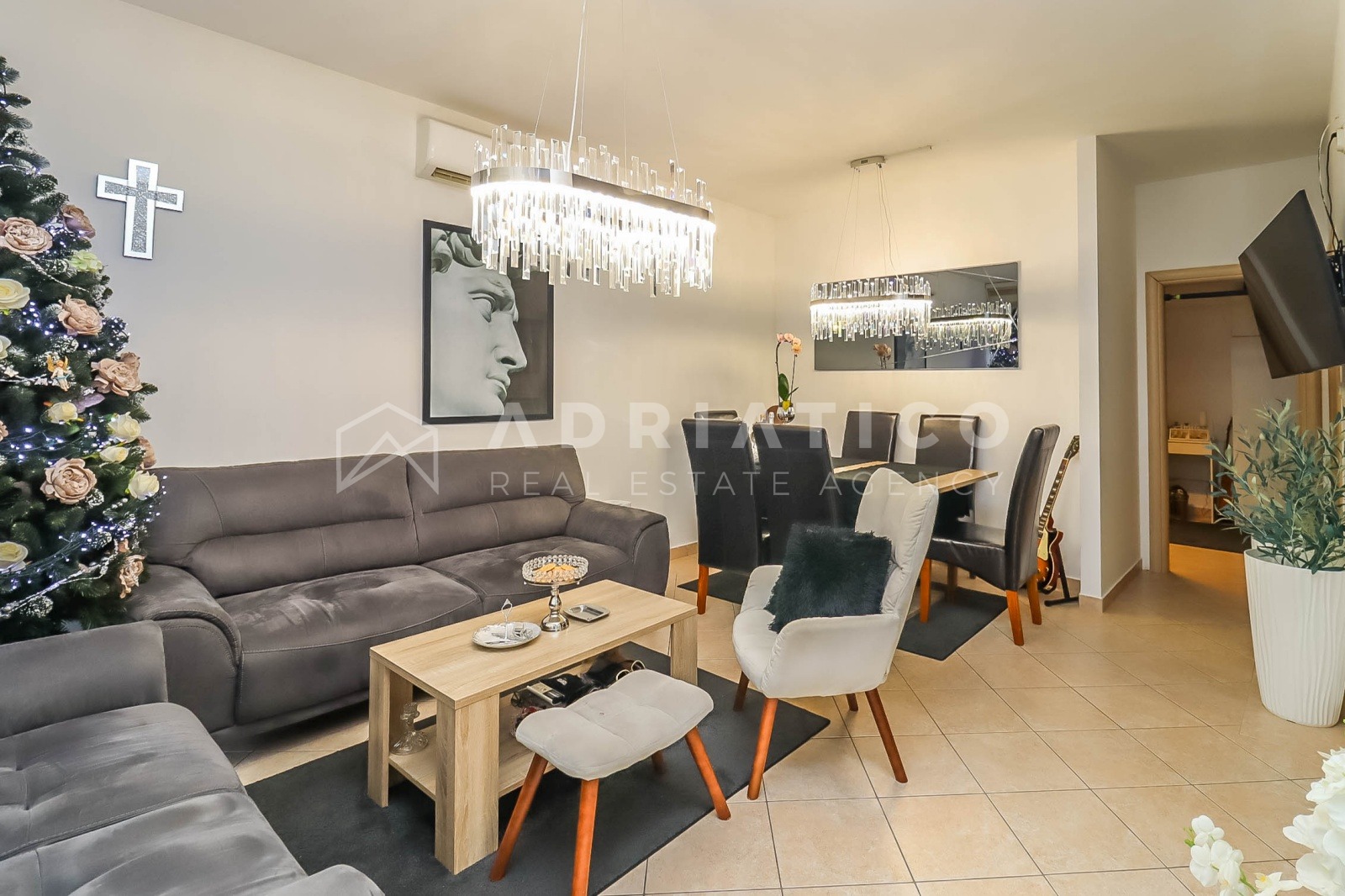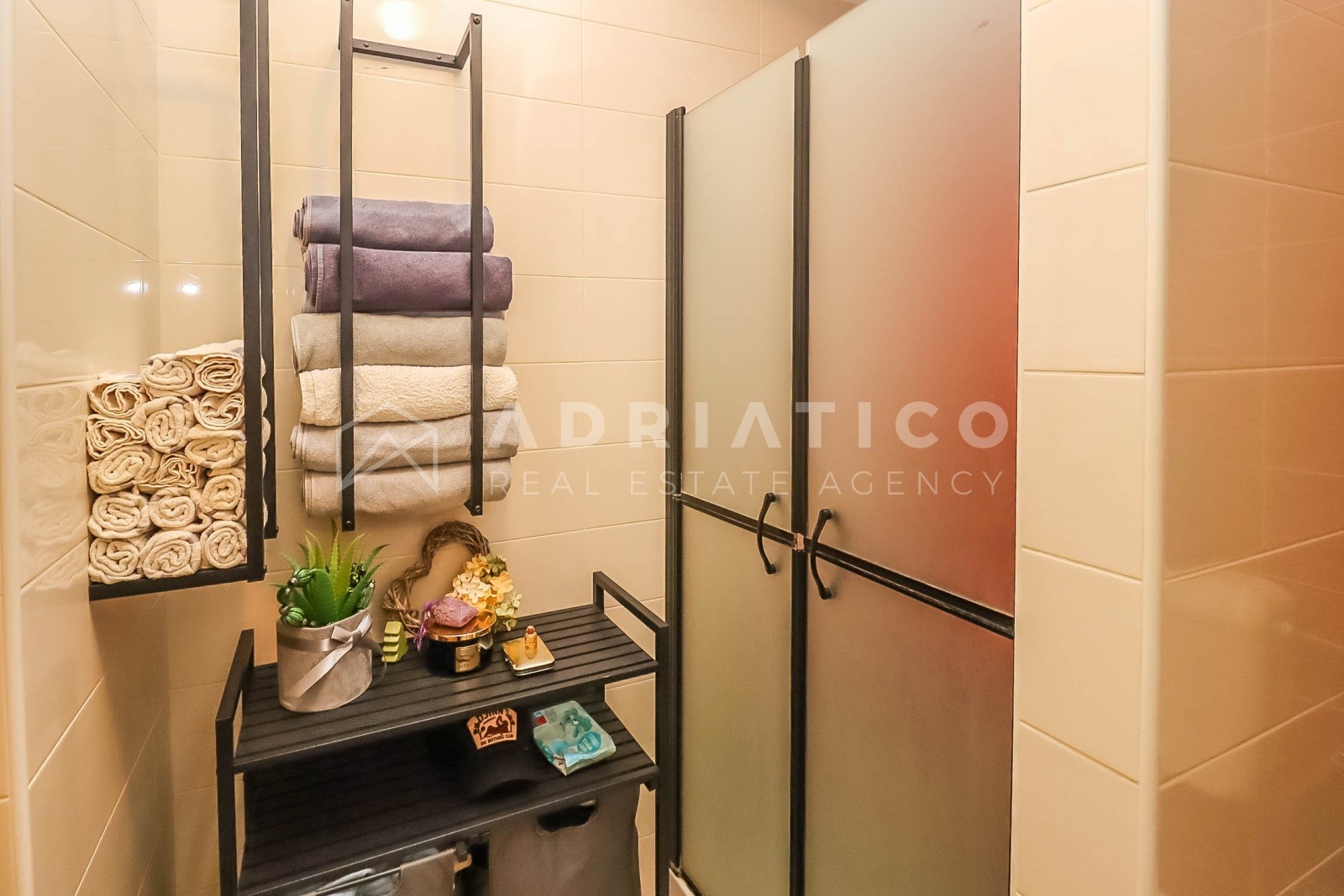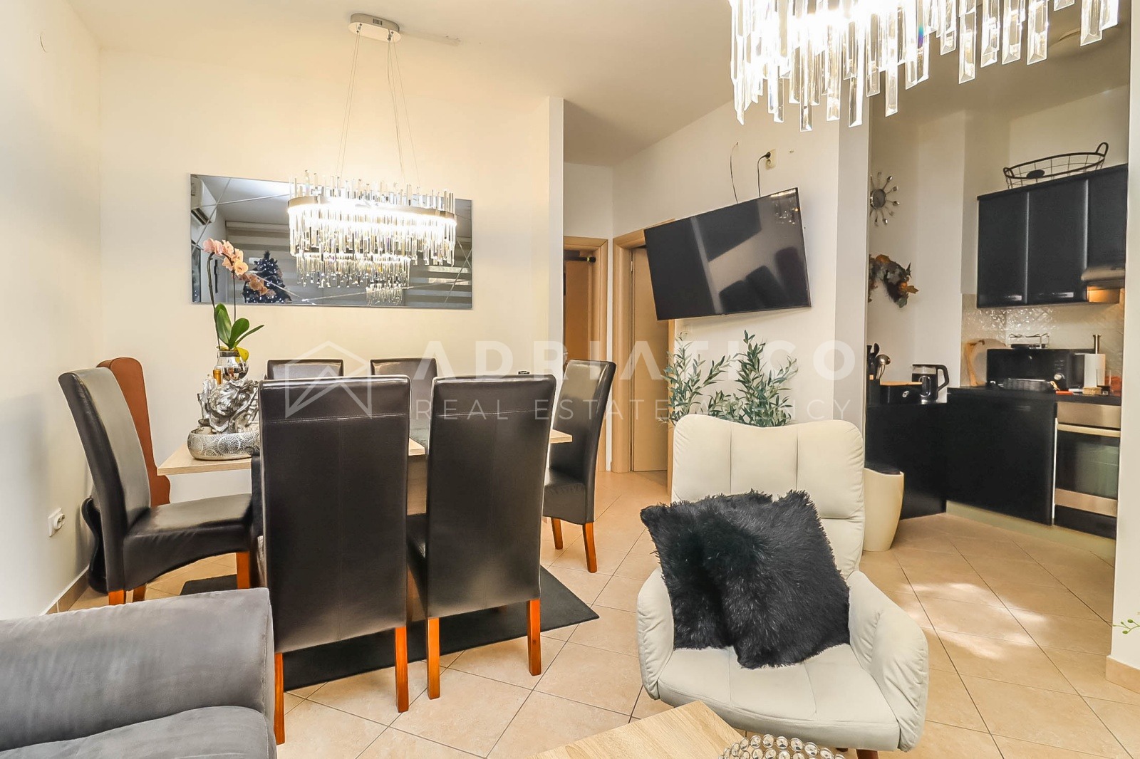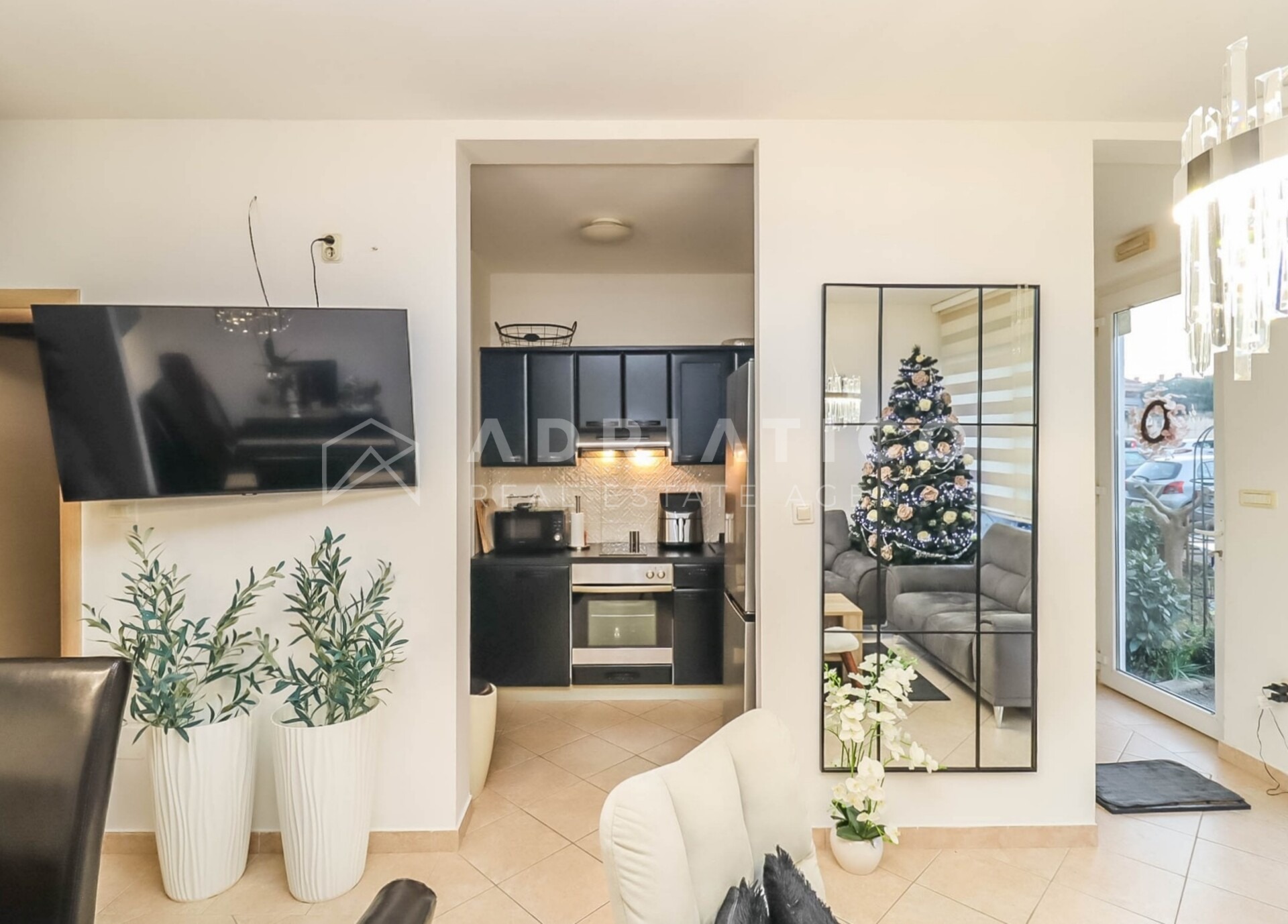 Die Wohnung ist in einem modernen und eleganten Stil gestaltet, mit neutralen Farbtönen, hochwertiger Beleuchtung und einer funktionalen Raumaufteilung, die eine optimale Nutzung der Fläche ermöglicht. Das Wohnzimmer ist hell und gemütlich, während das Schlafzimmer Ruhe und Erholung bietet.