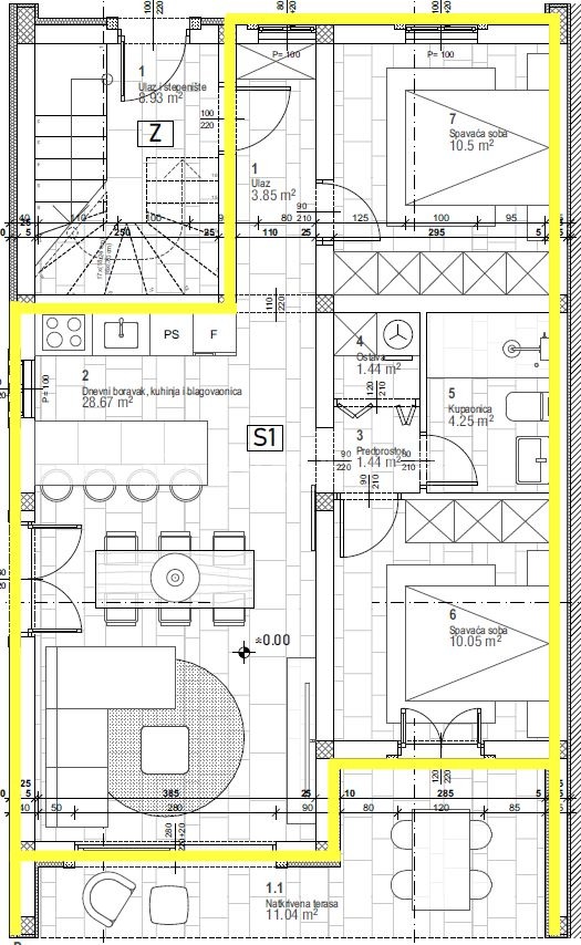 The apartment is part of a newly developed complex consisting of four townhouse-style buildings in a row, each housing two apartments, as well as three additional townhouse buildings, also with two apartments each.