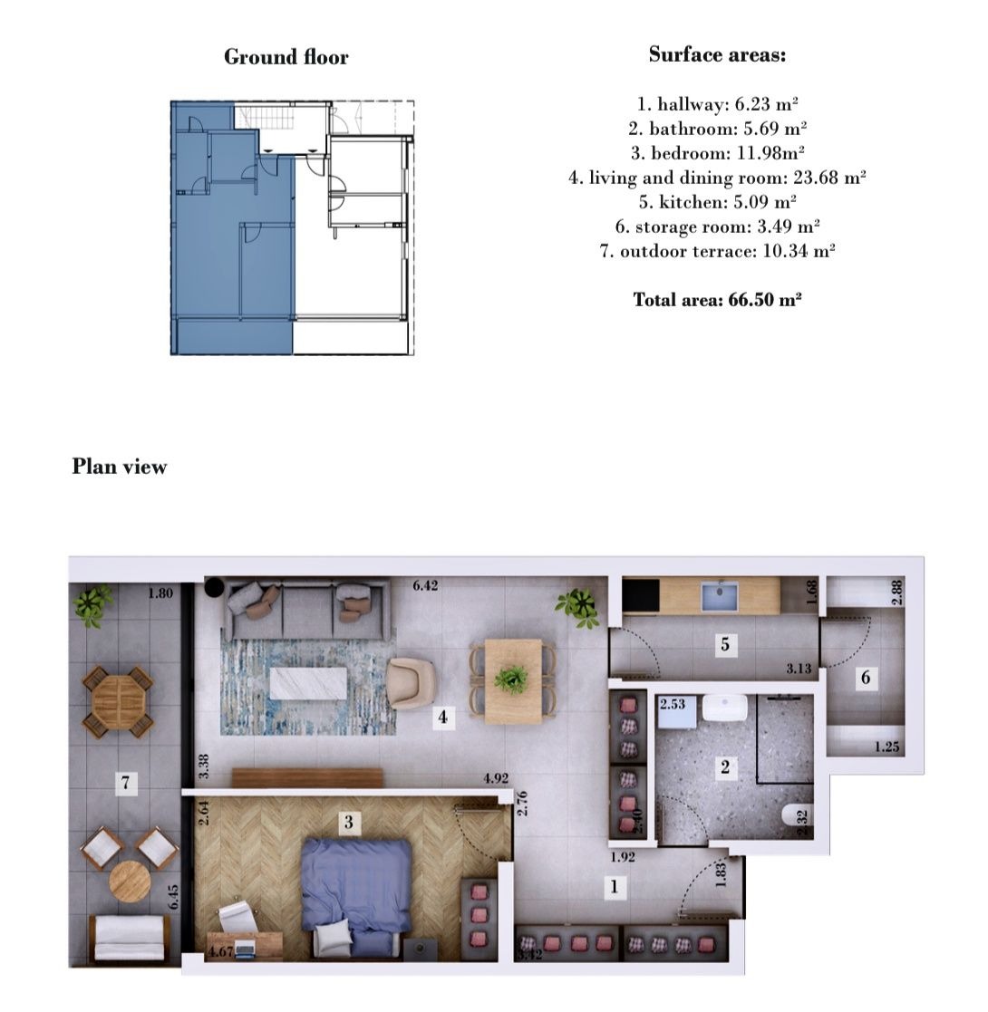 The ground-floor apartment has an area of 66.50 m² and consists of a living room with dining area, kitchen, bathroom, one bedroom, hallway, storage, and terrace.