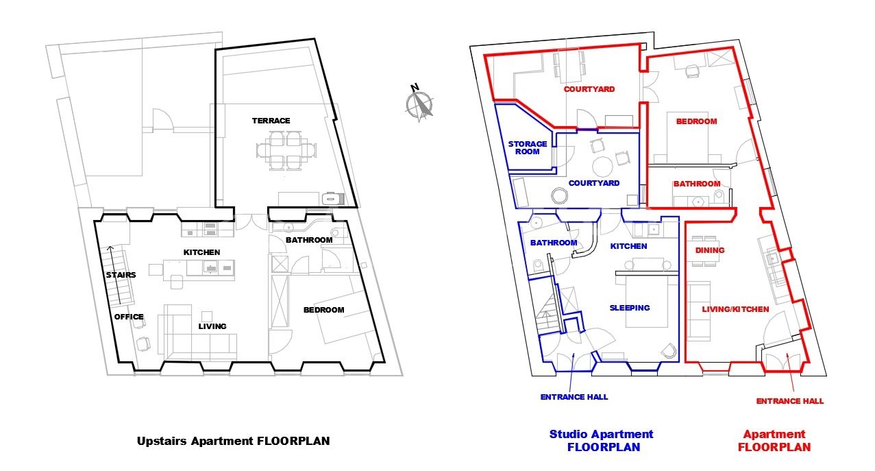 The apartment is divided into a bedroom with a kitchen and dining room, a bathroom and an inner courtyard with an outer storage room.