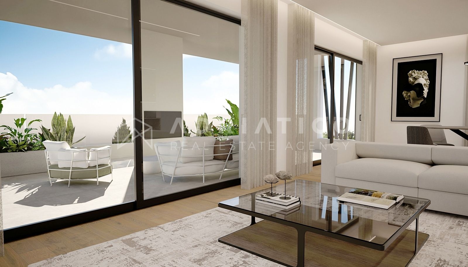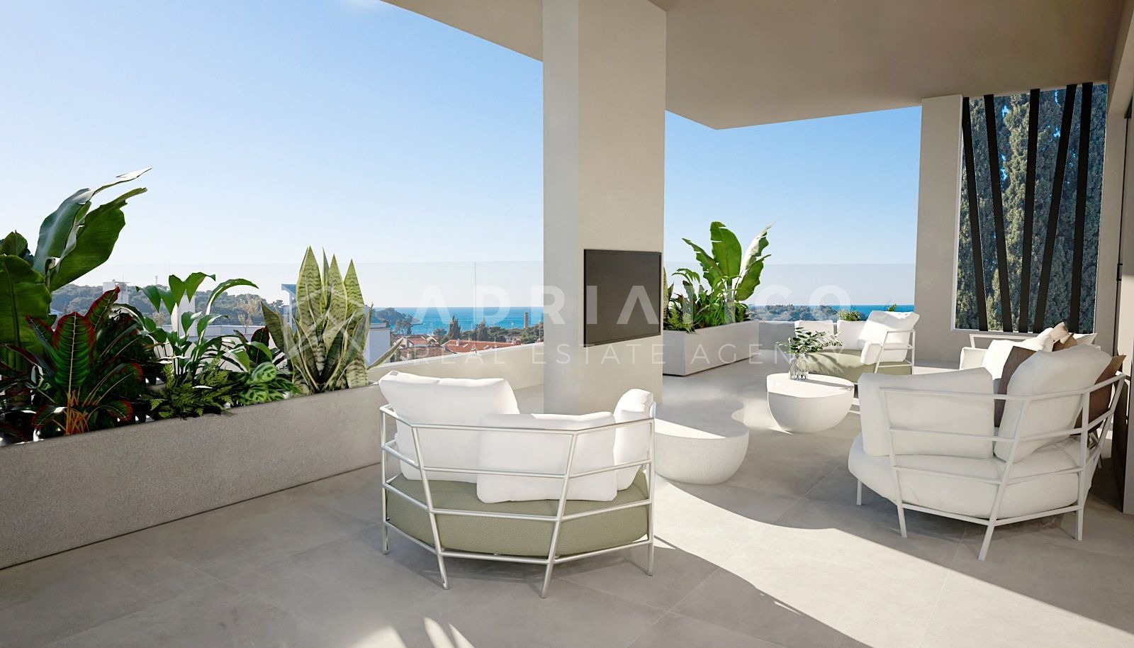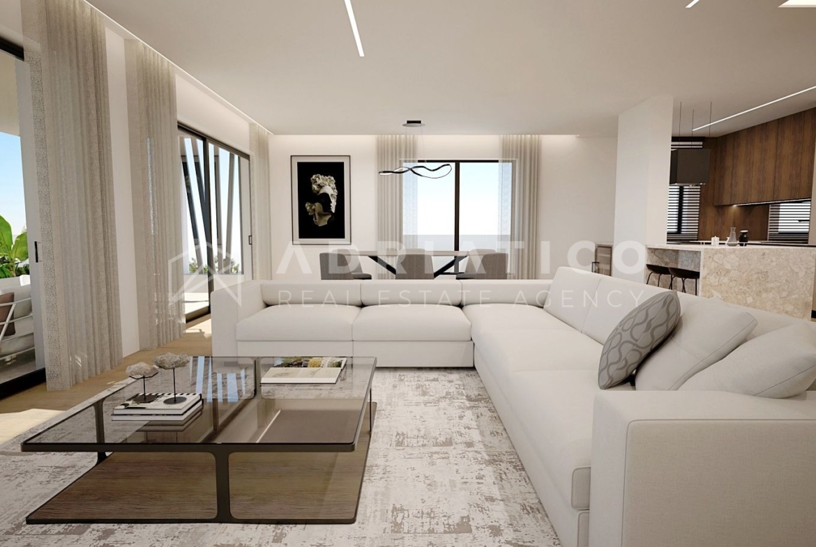 The first-floor apartment with a living area of 189m2 consists of an entrance hall, kitchen, dining room, and spacious living room combined with access to a large terrace, three bedrooms with en-suite bathrooms and walk-in closets, a balcony, a utility room, and a toilet.