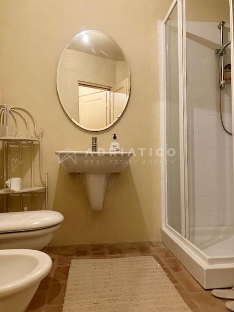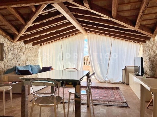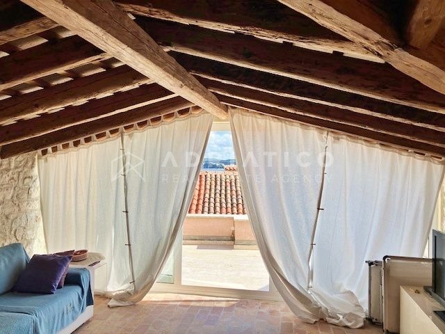 There is a two-story apartment with a terrace on the second and third floors. On the first floor there is a bedroom with a fireplace, a bathroom and a toilet, while in the high attic there is a kitchen, a dining room and a living room with access to a terrace with a view of the sea.