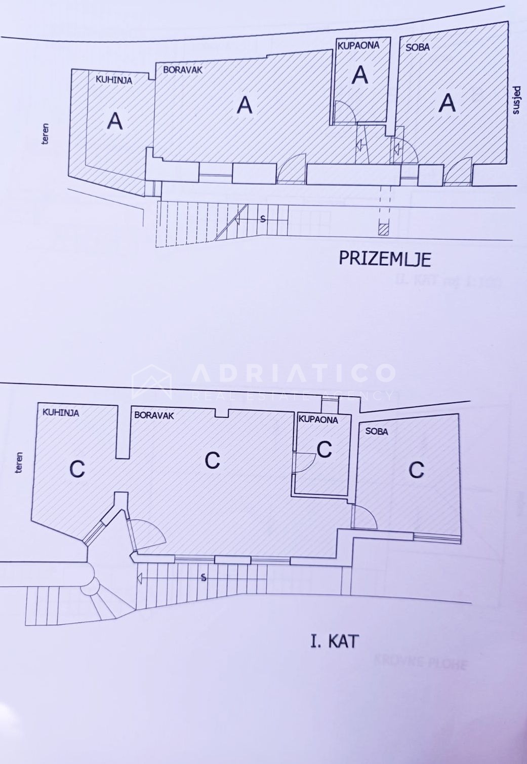Al primo piano si trova un appartamento con una superficie abitabile di 45 mq e ha la stessa disposizione dell’appartamento al piano terra. Sullo stesso livello è presente un terrazzo.