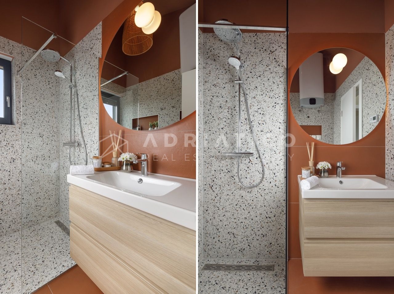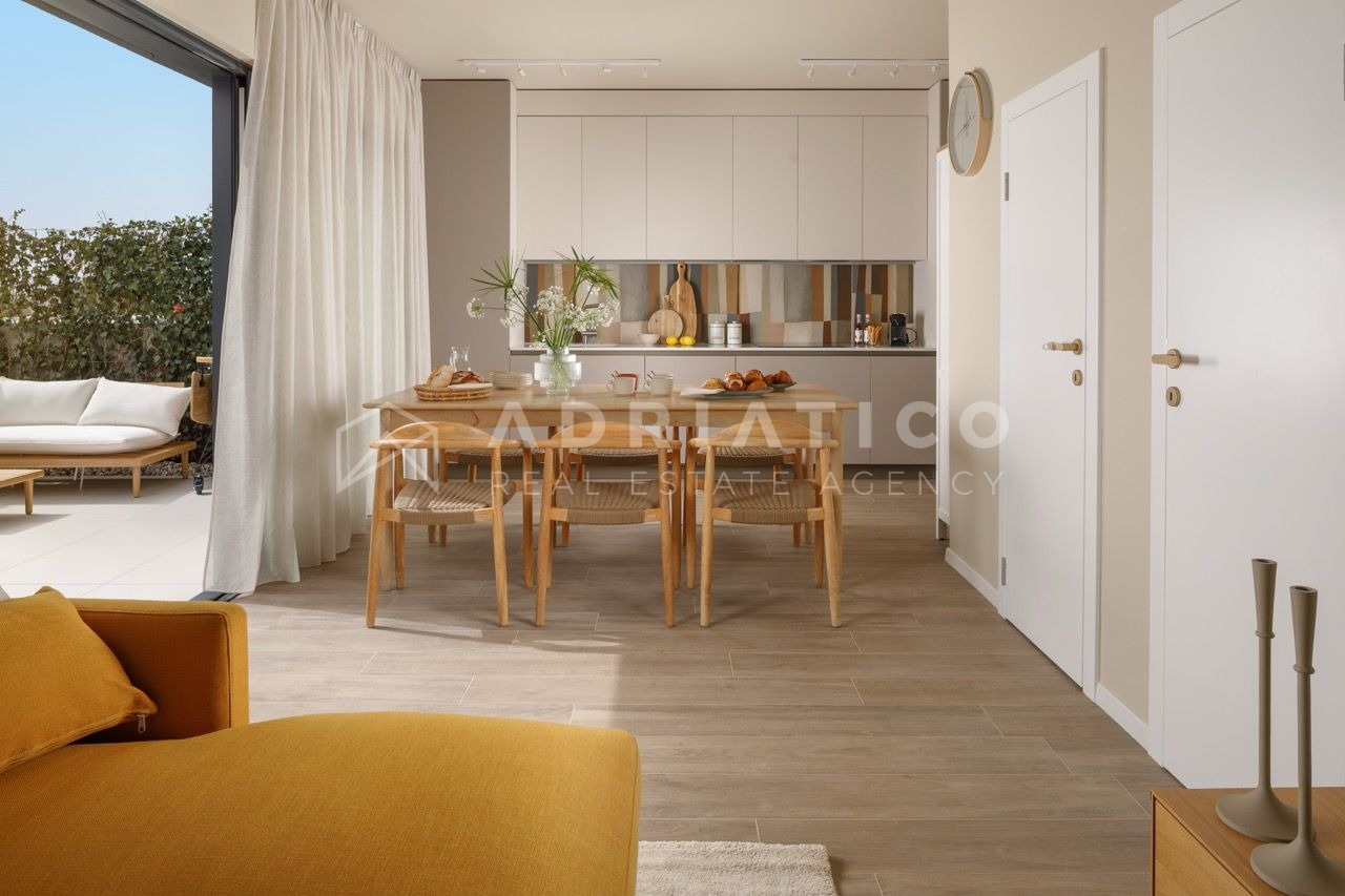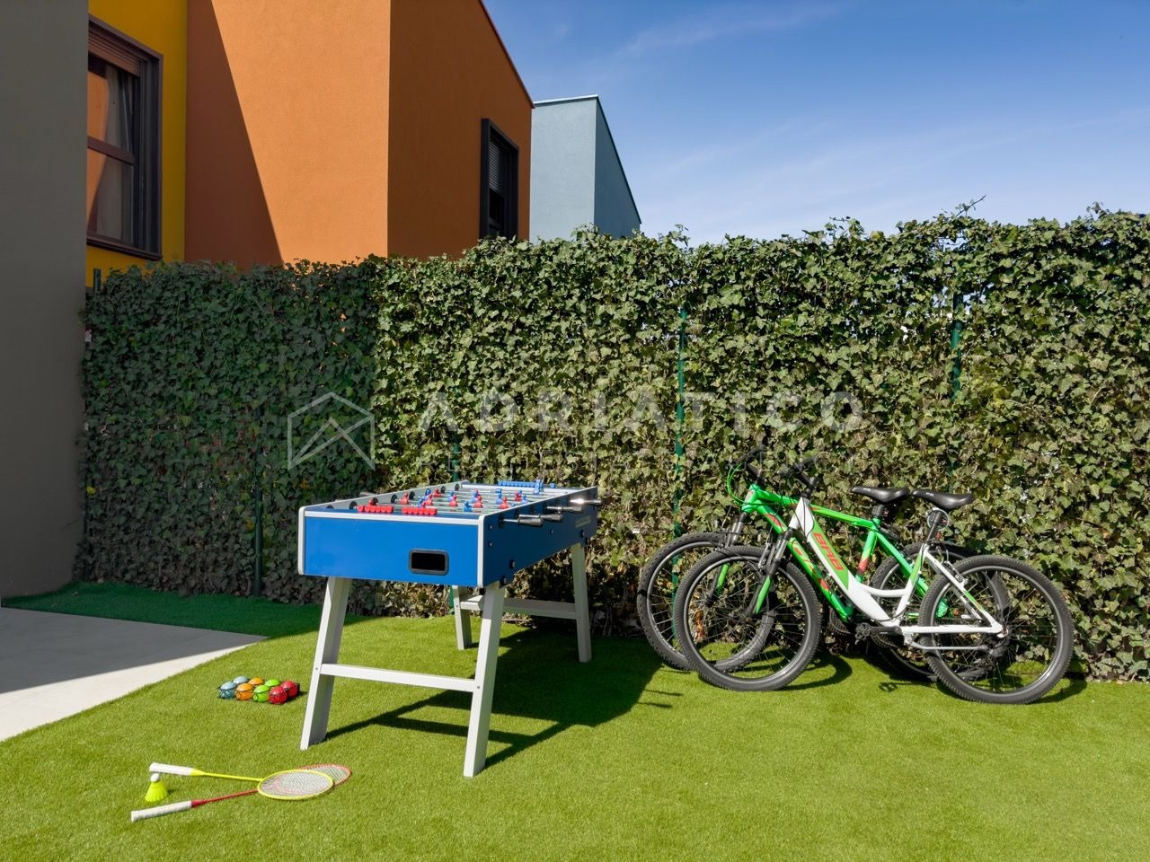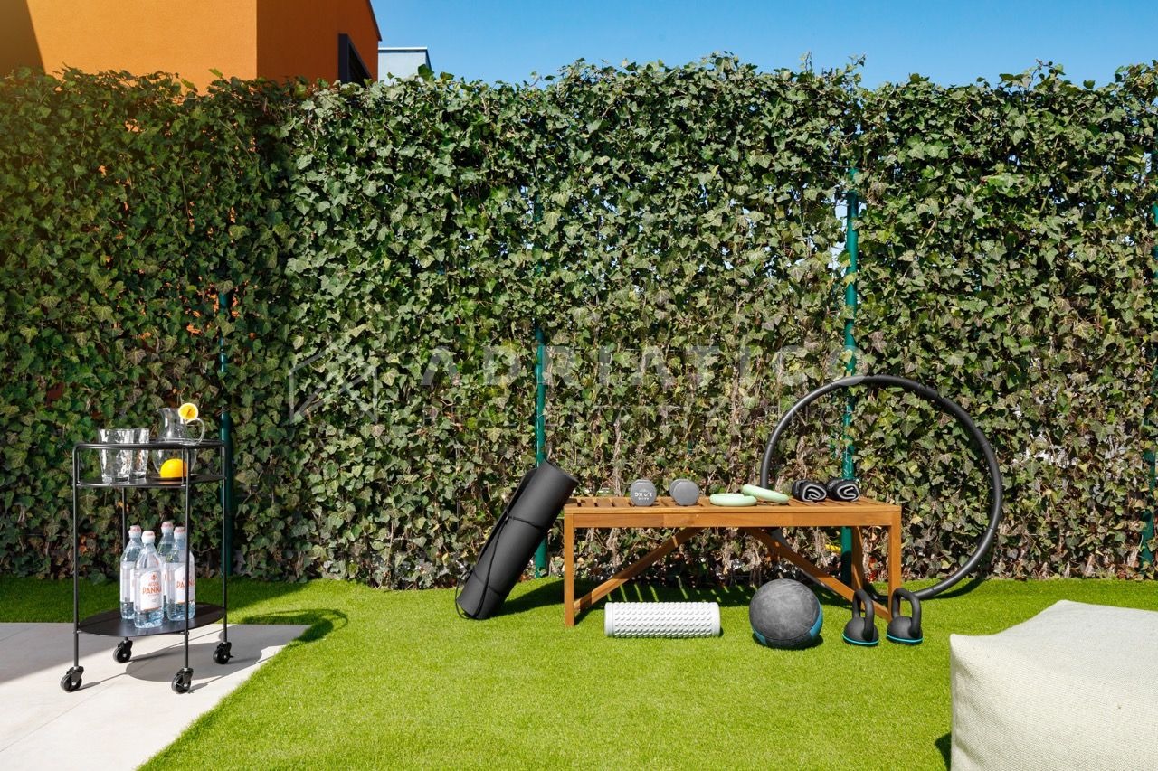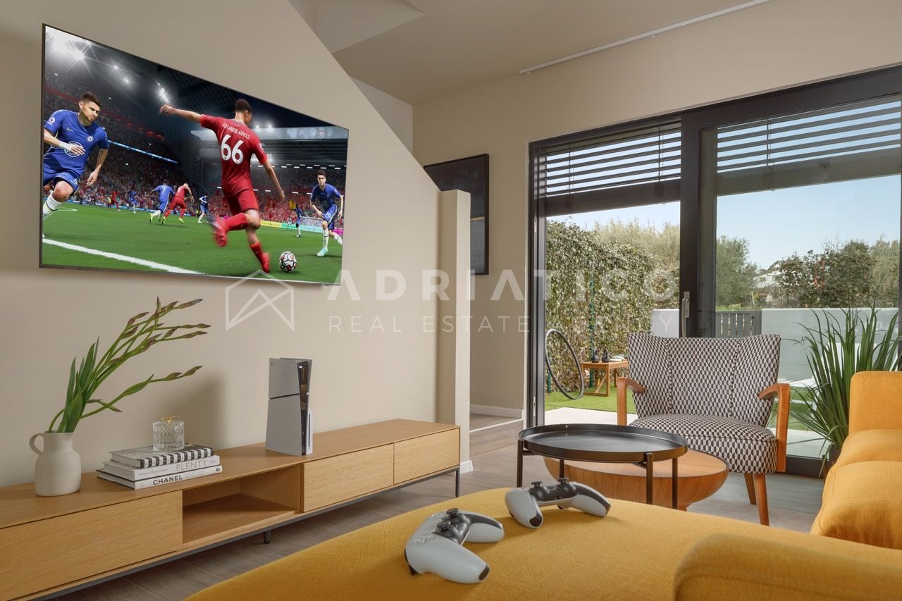 Iz dnevnog boravka izlazi se u uređeni, ograđeni vrt s opuštajućom zonom koja je savršena za uživanje na svježem zraku.
