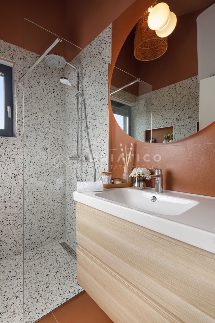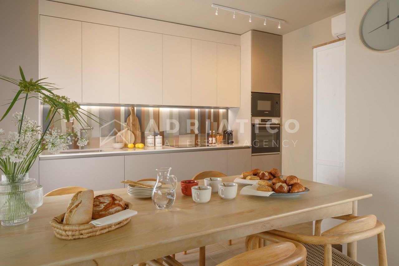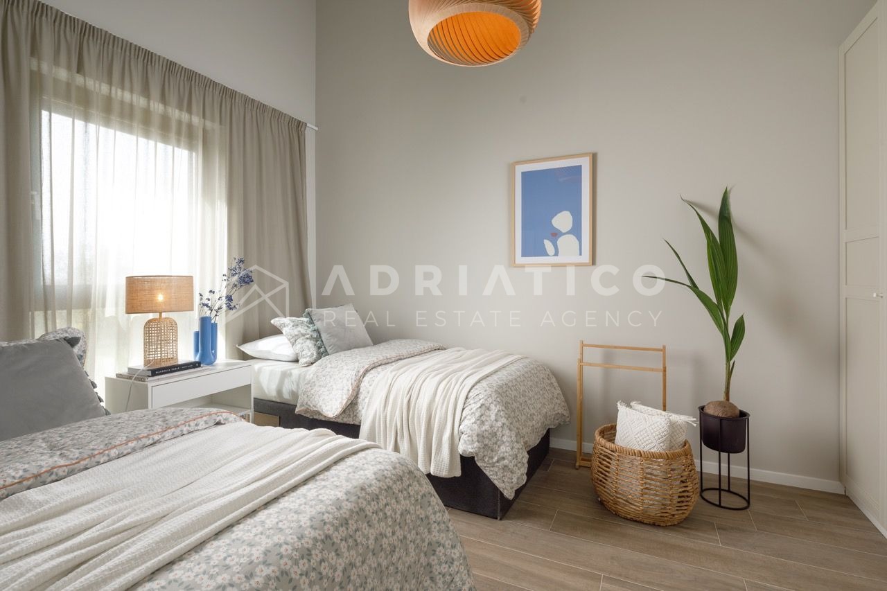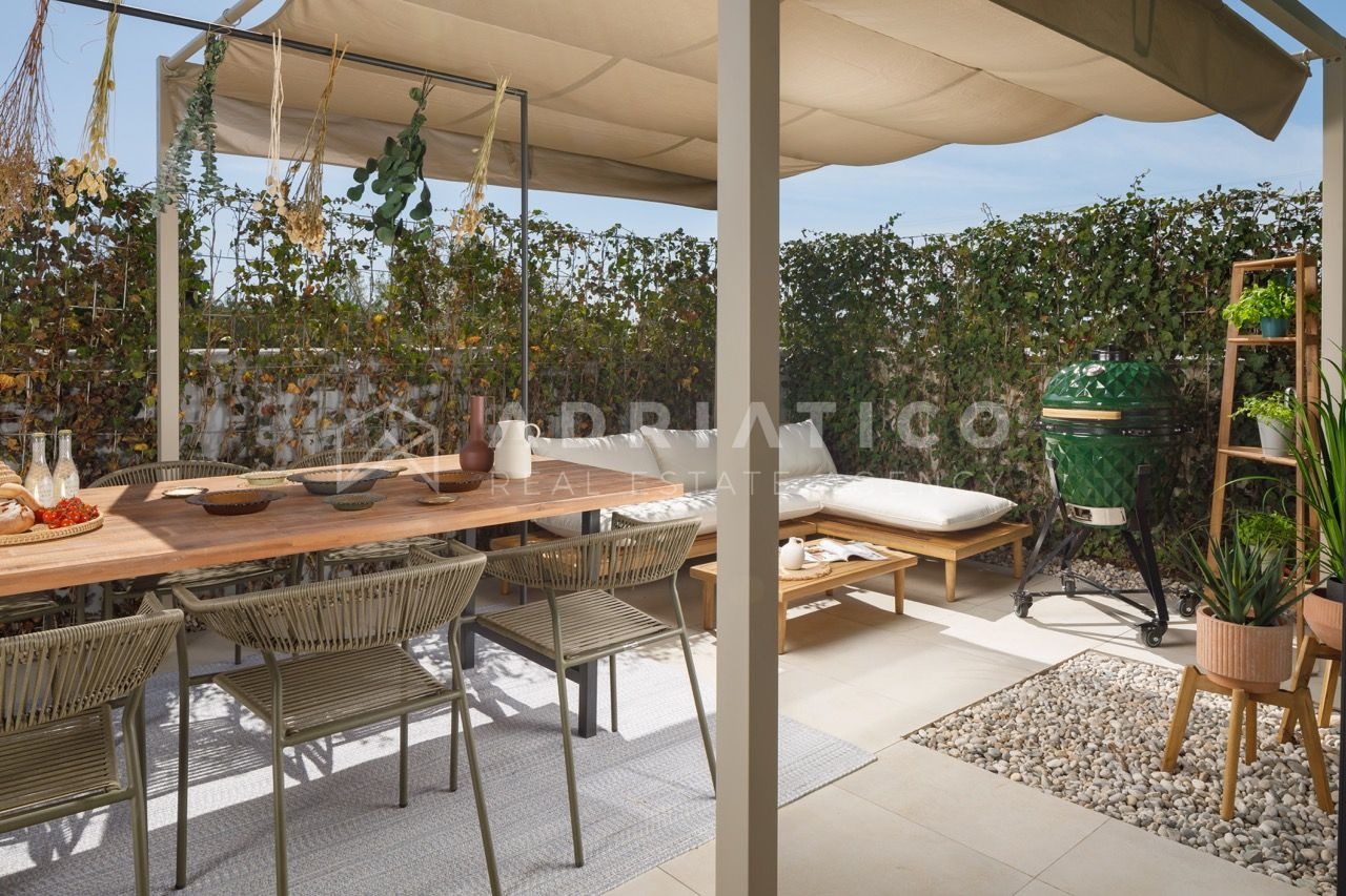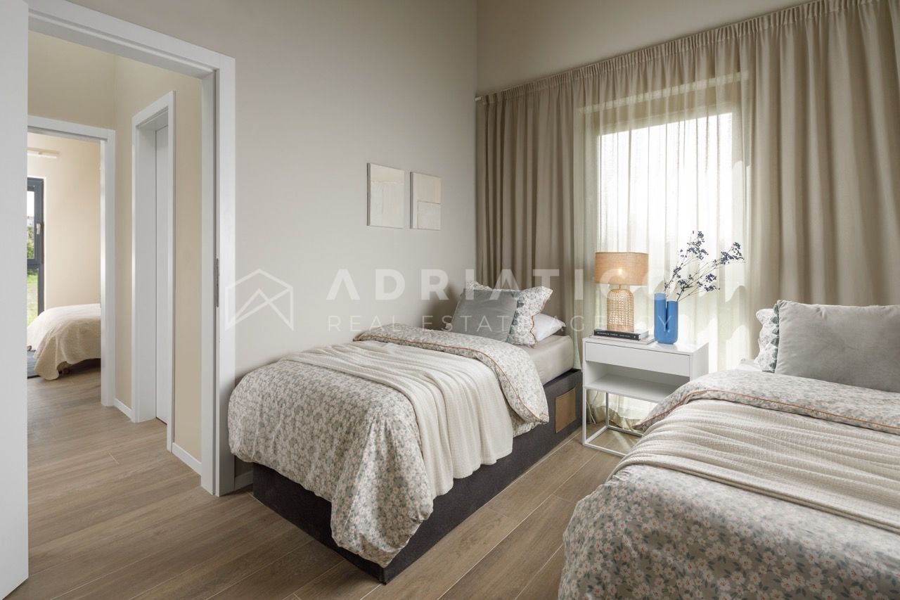Iz dnevnog boravka izlazi se u uređeni, ograđeni vrt s opuštajućom zonom koja je savršena za uživanje na svježem zraku.