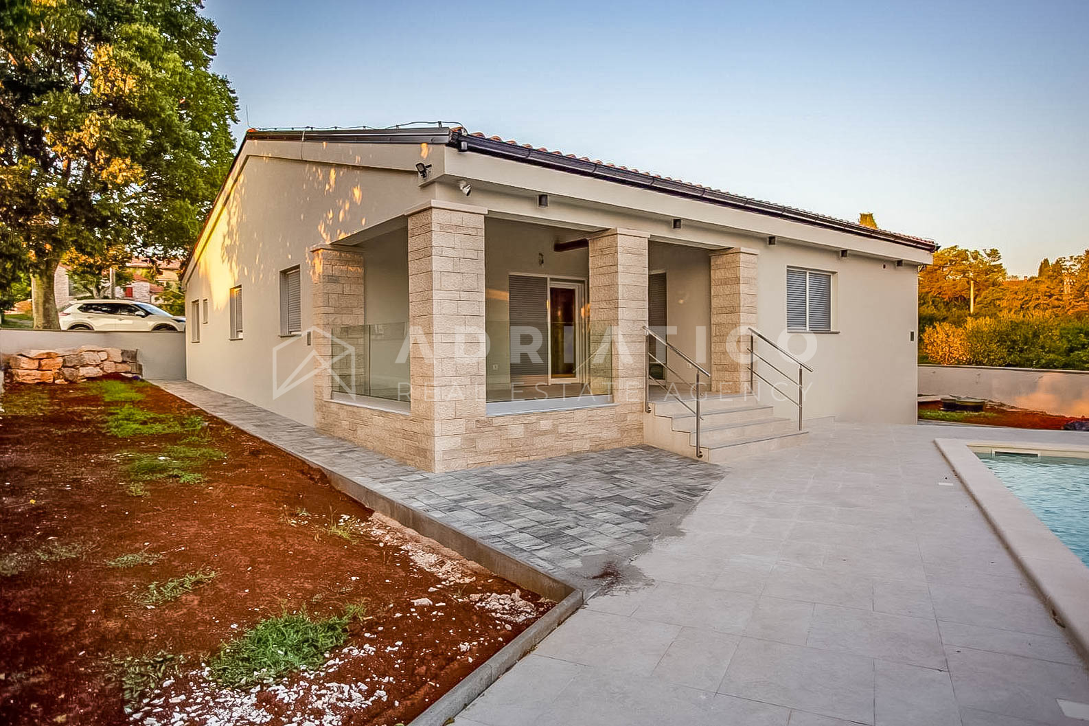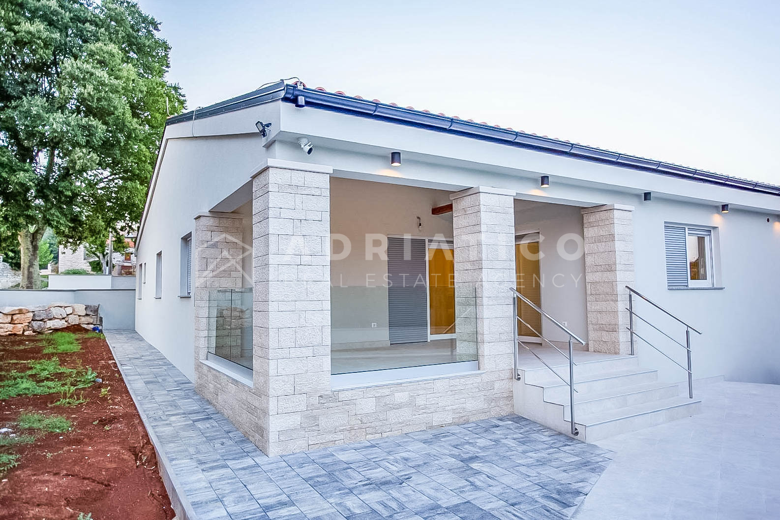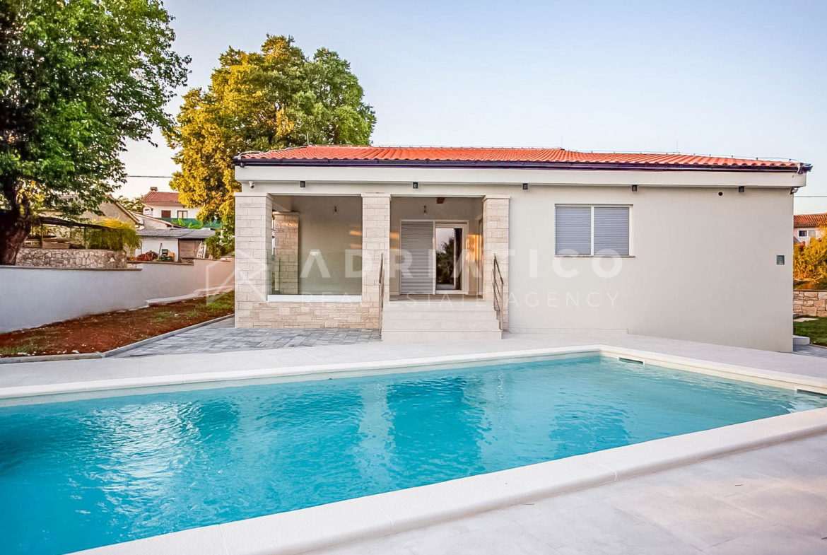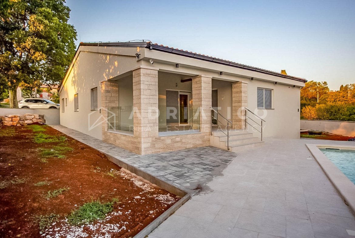 U mirnom i uređenom naselju nedaleko Rovinja i Kanfanara, prodaje se moderna prizemna niskoenergetska kuća, ukupne površine 147 m².