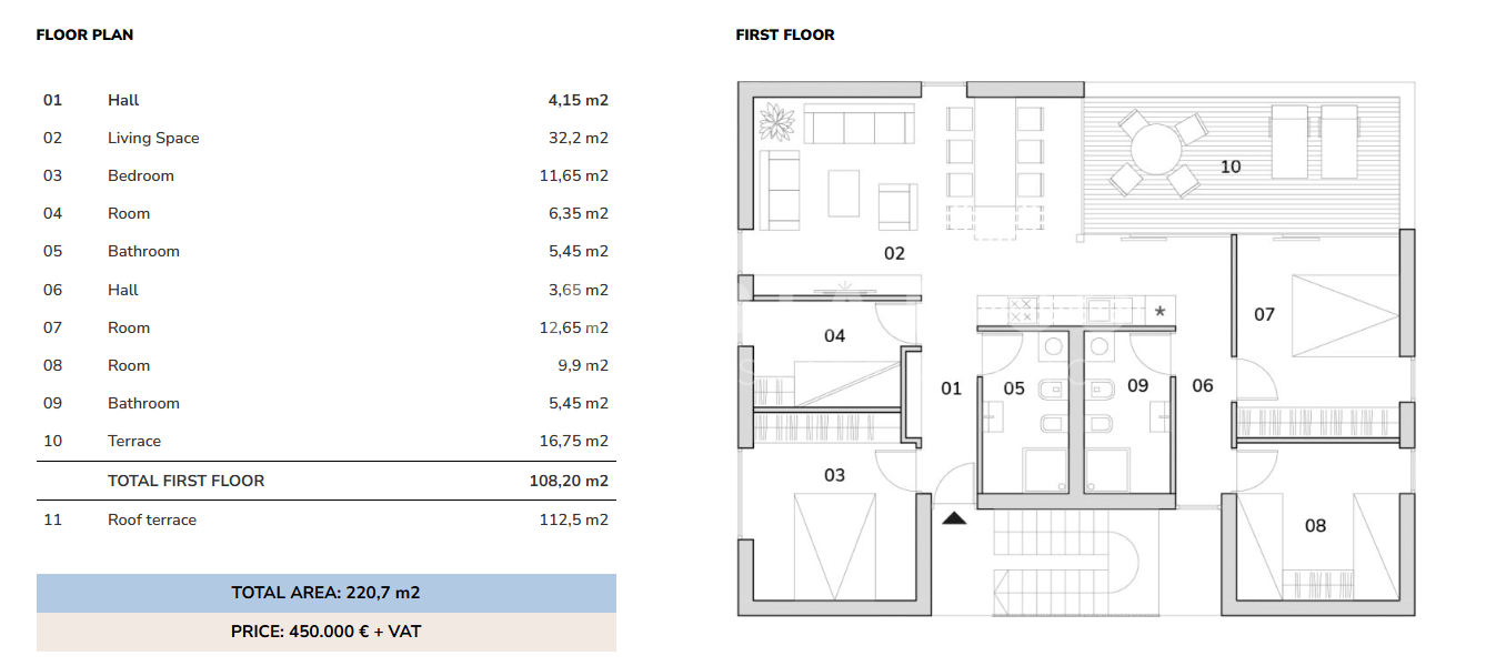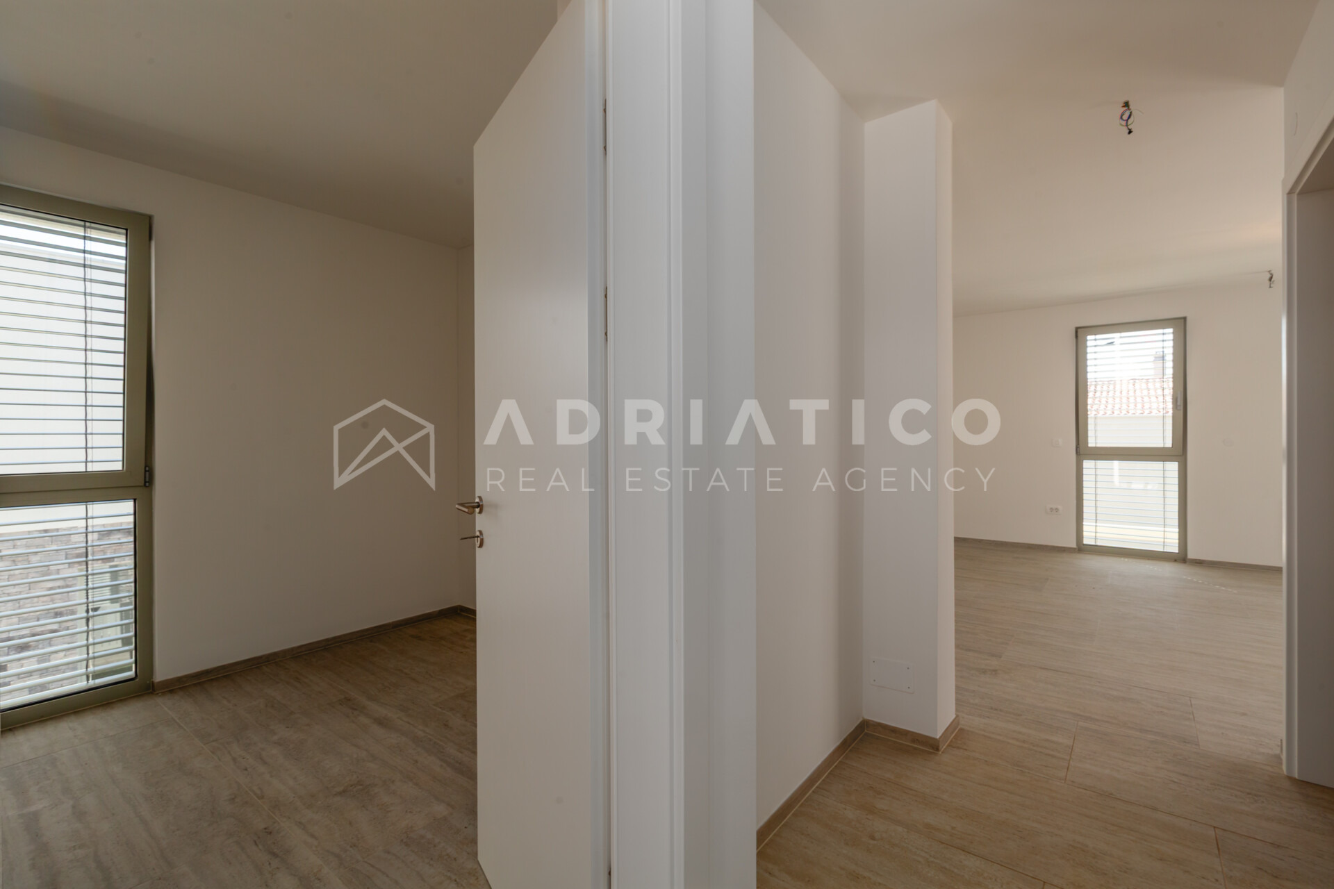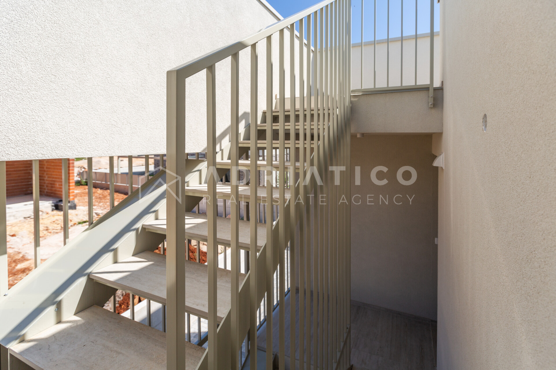 Prodaje se moderan stan u novogradnji, smješten svega 300 metara od mora i uređene plaže. Sa 108 m² stambene površine, stan nudi iznimno funkcionalan raspored koji uključuje četiri prostrane spavaće sobe, svijetao dnevni boravak i dvije kupaone. Posebnu vrijednost ovoj nekretnini daje impresivna krovna terasa od 112,5 m² s koje se pruža prekrasan, otvoren pogled na more, idealan za opuštanje, druženja i uživanje tijekom cijele godine.