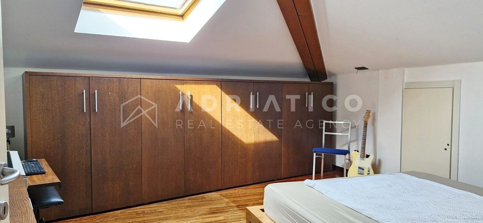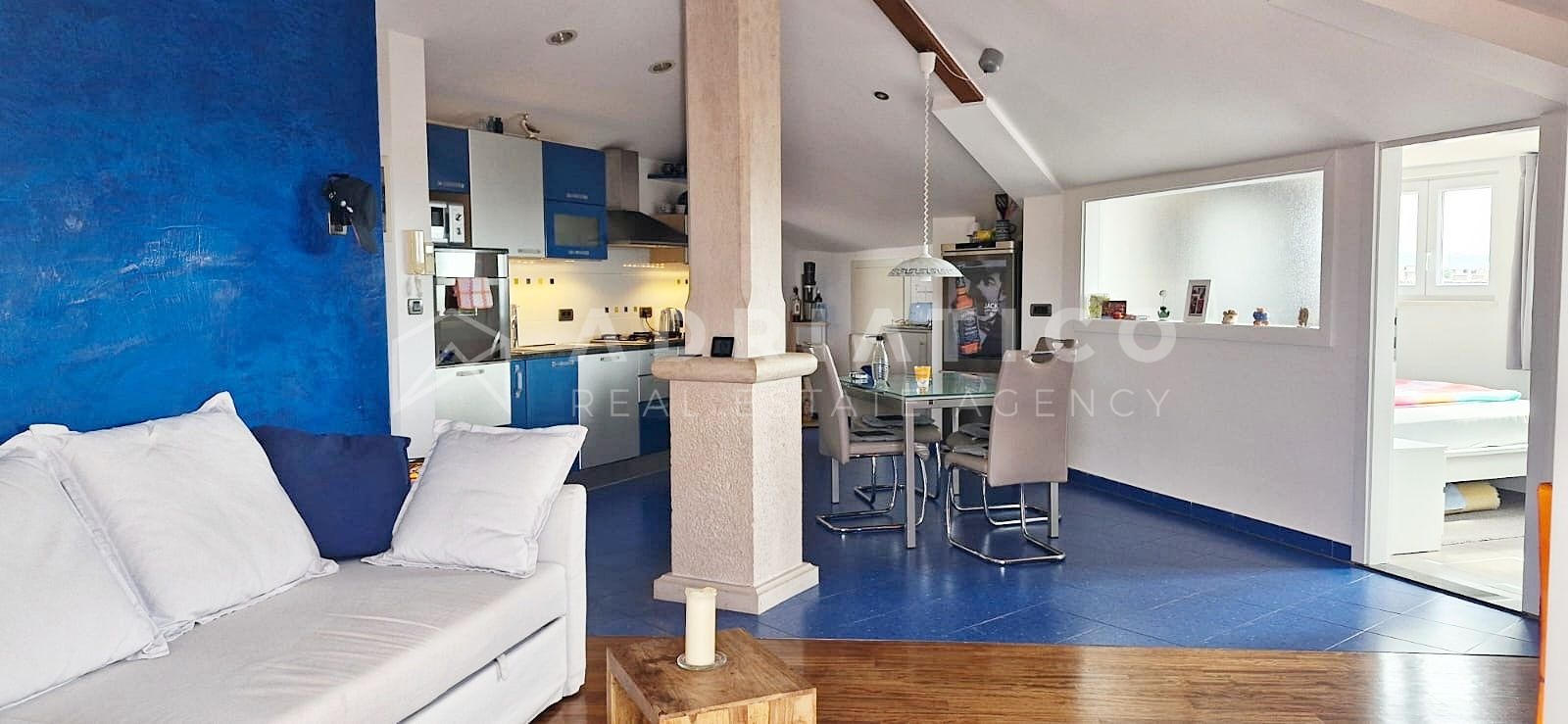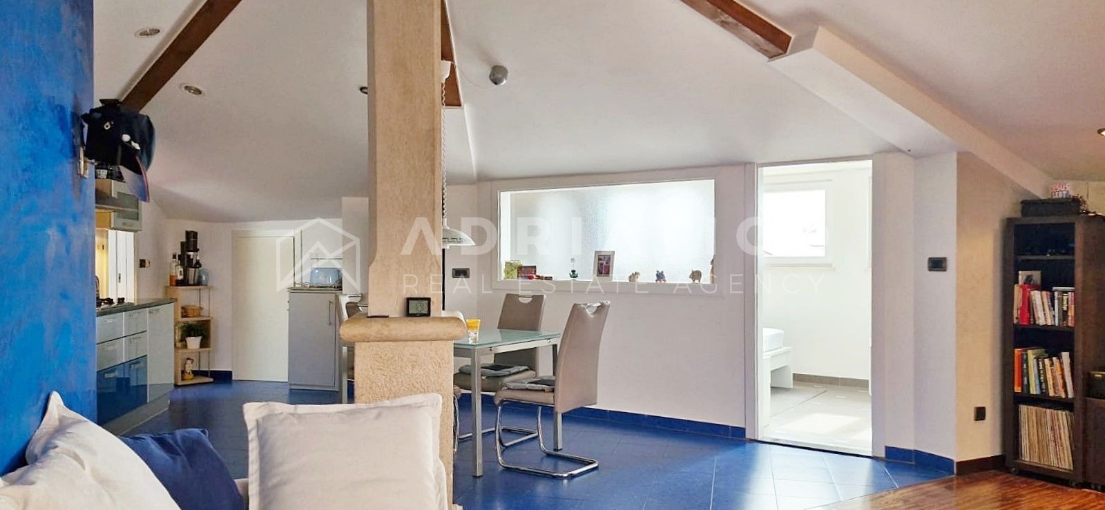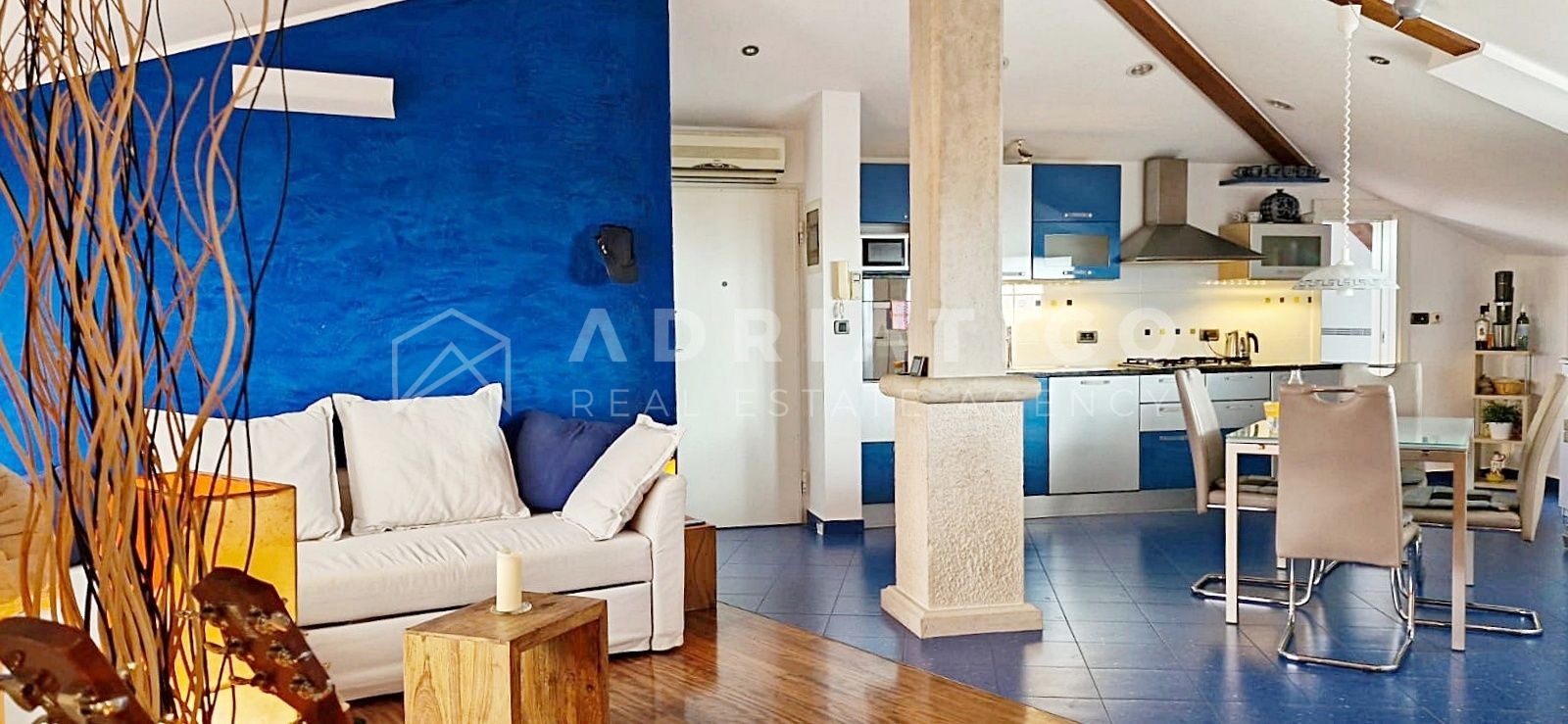 Na samo 10tak min hoda do plaže nalazi se ovaj svijetao i ugodan stan površine 90,60 m², smješten u potkrovlju suvremene zgrade u jednom od najpoželjnijih dijelova Rovinja.