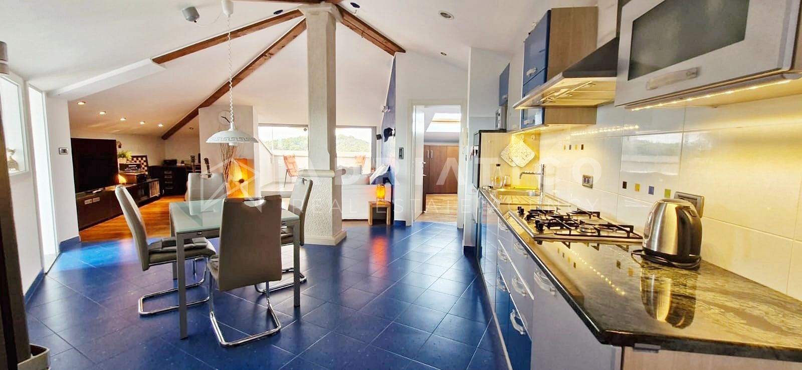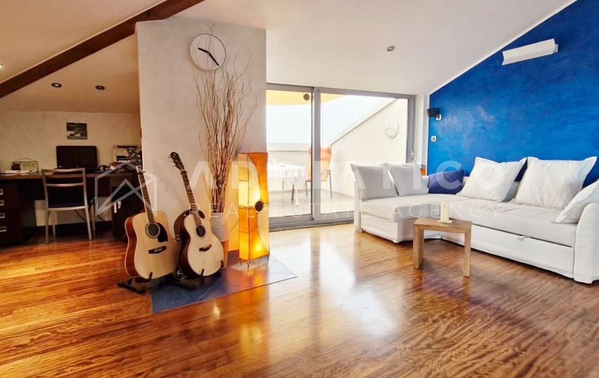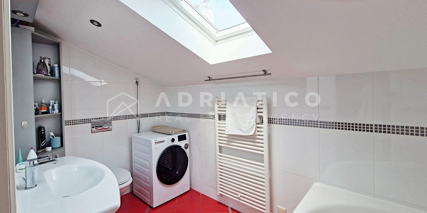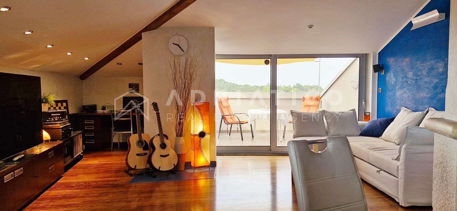 Na samo 10tak min hoda do plaže nalazi se ovaj svijetao i ugodan stan površine 90,60 m², smješten u potkrovlju suvremene zgrade u jednom od najpoželjnijih dijelova Rovinja.