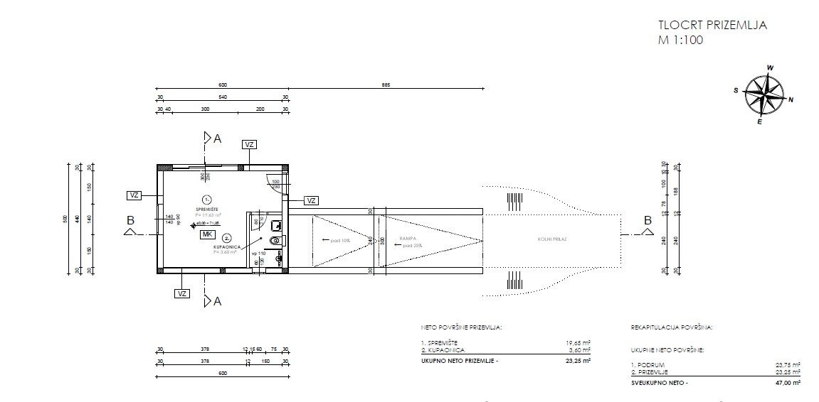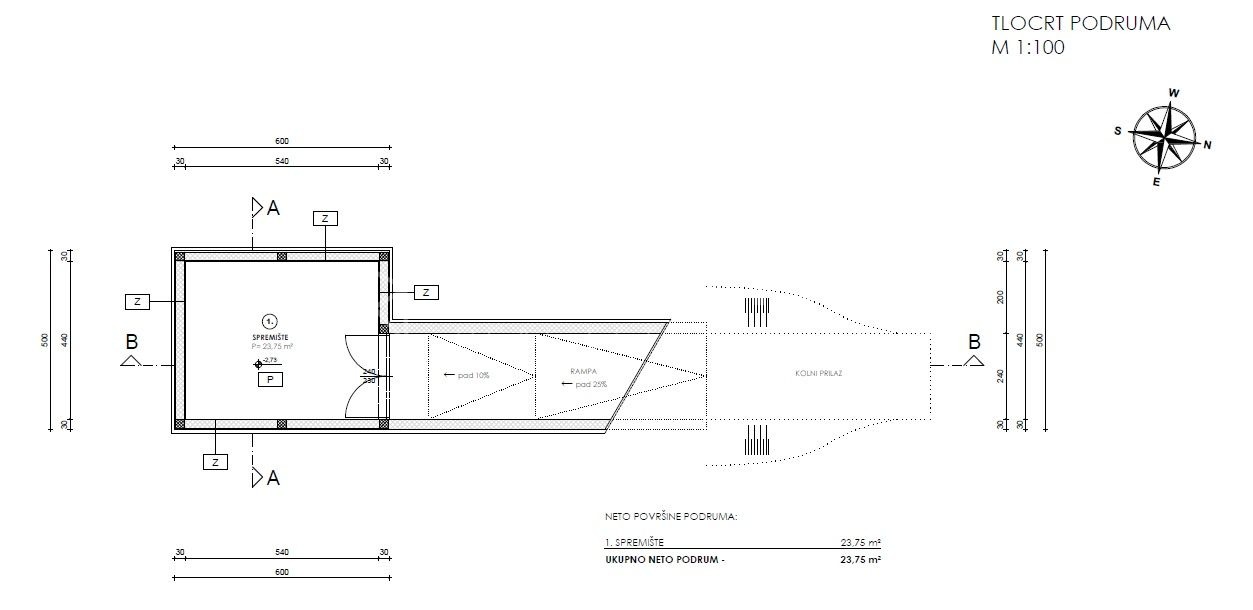 Prema projektu, u prizemlju je predviđena jedna prostorija i kupaonica, dok je podrum planiran kao spremište s pristupom putem rampe izvana.