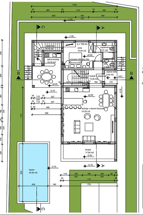 Priprema za bazen je izvedena, uključujući kotlovnicu za bazen. Na okućnici se nalaze prednji i stražnji vrt, kao i parkiralište za tri vozila.