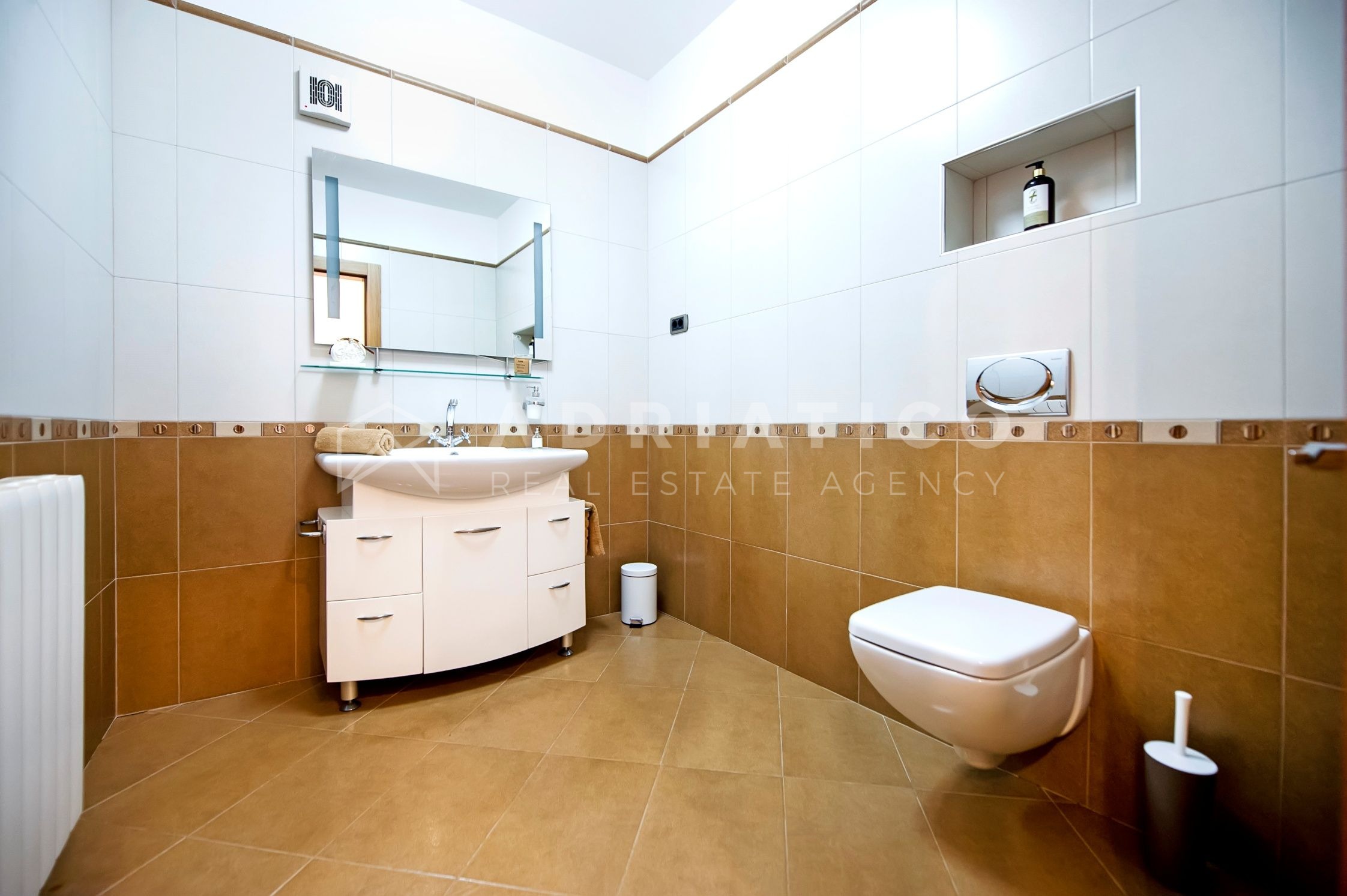 – u prizemlju ćete osim prostranog i potpuno opremljenog apartmana pronaći i konobu s kuhinjom i toaletom koja je opremljena svim sadržajima za ugodno druženje. I konoba i apartman pružaju izravan izlaz na natkrivenu terasu ispred koje se prostire impozantan grijani bazen od 32m2 sa sunčalištem i vanjskom kuhinjom. U drugom dijelu prizemlja nalazi se i velika garaža za 2 automobila;