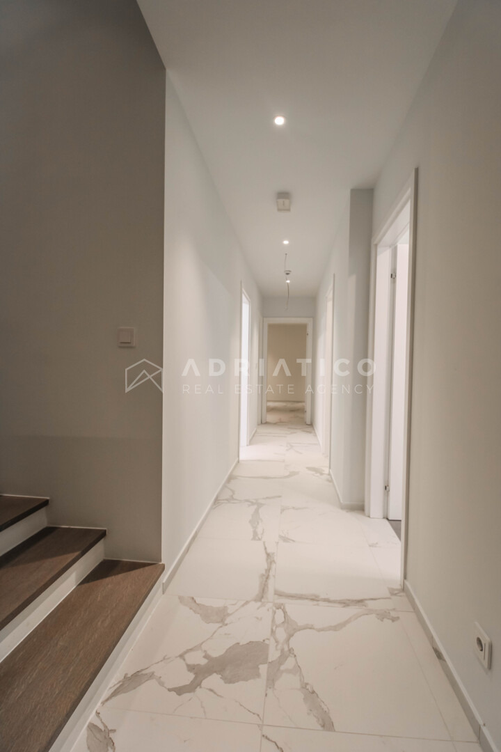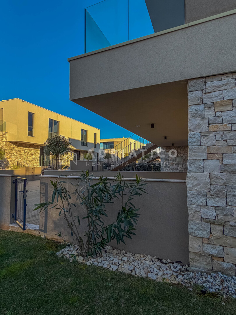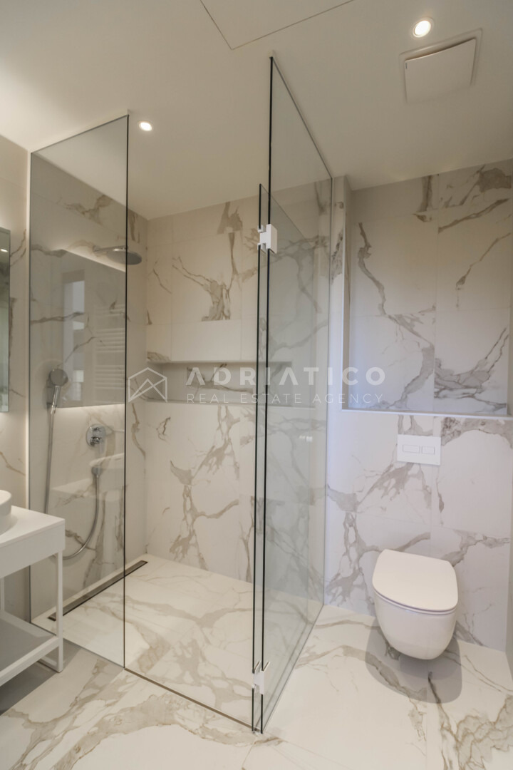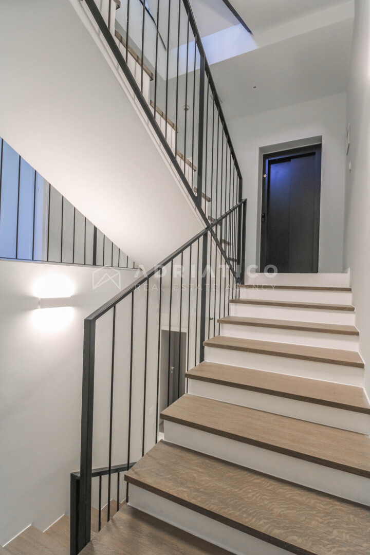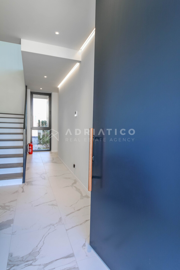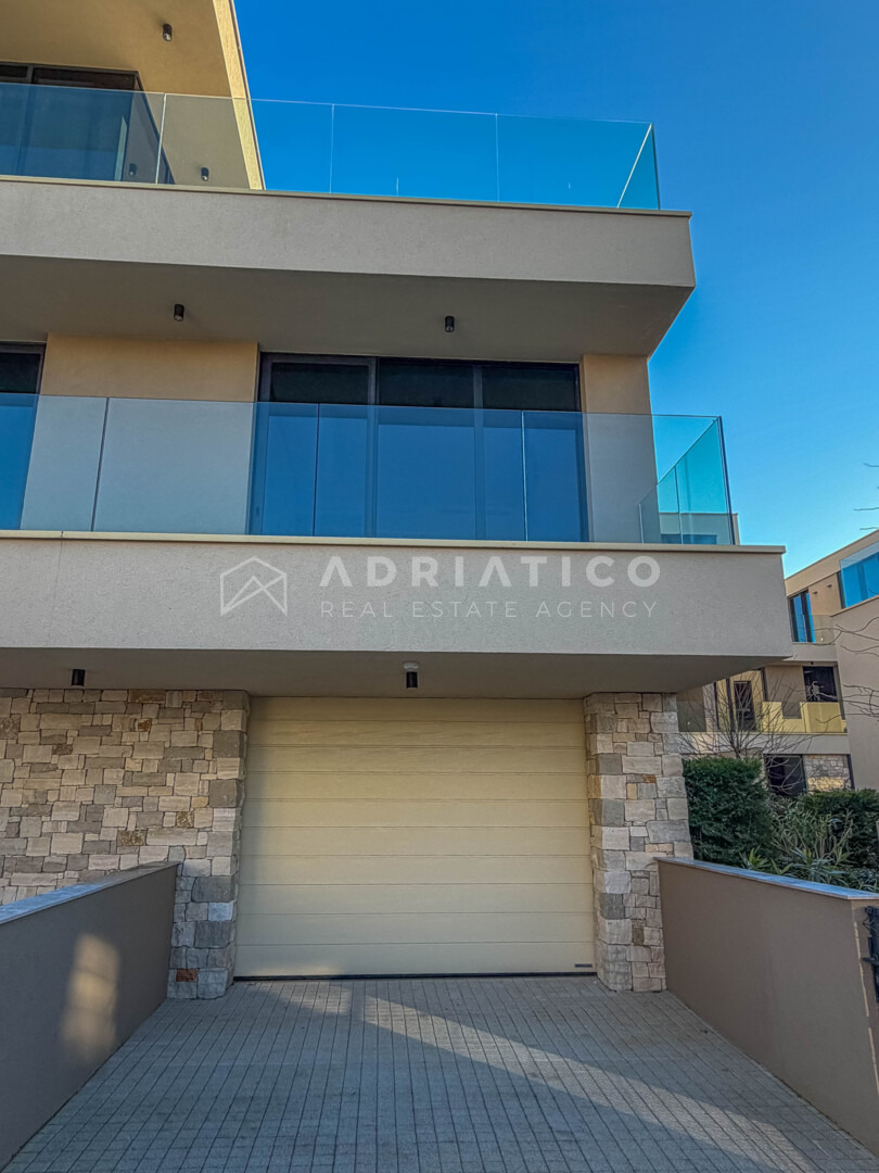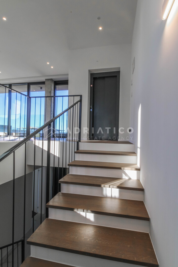Kuća se prostire na funkcionalno organiziranim etažama koje su međusobno povezane privatnim liftom, pružajući potpunu udobnost i pristupačnost svim generacijama. Arhitektonski koncept osmišljen je s naglaskom na prozračnost, obilje prirodnog svjetla i maksimalno iskorištavanje jedne od najvećih vrijednosti ove nekretnine – otvorenog pogleda na more koji ostaje neometan.
