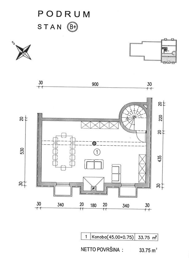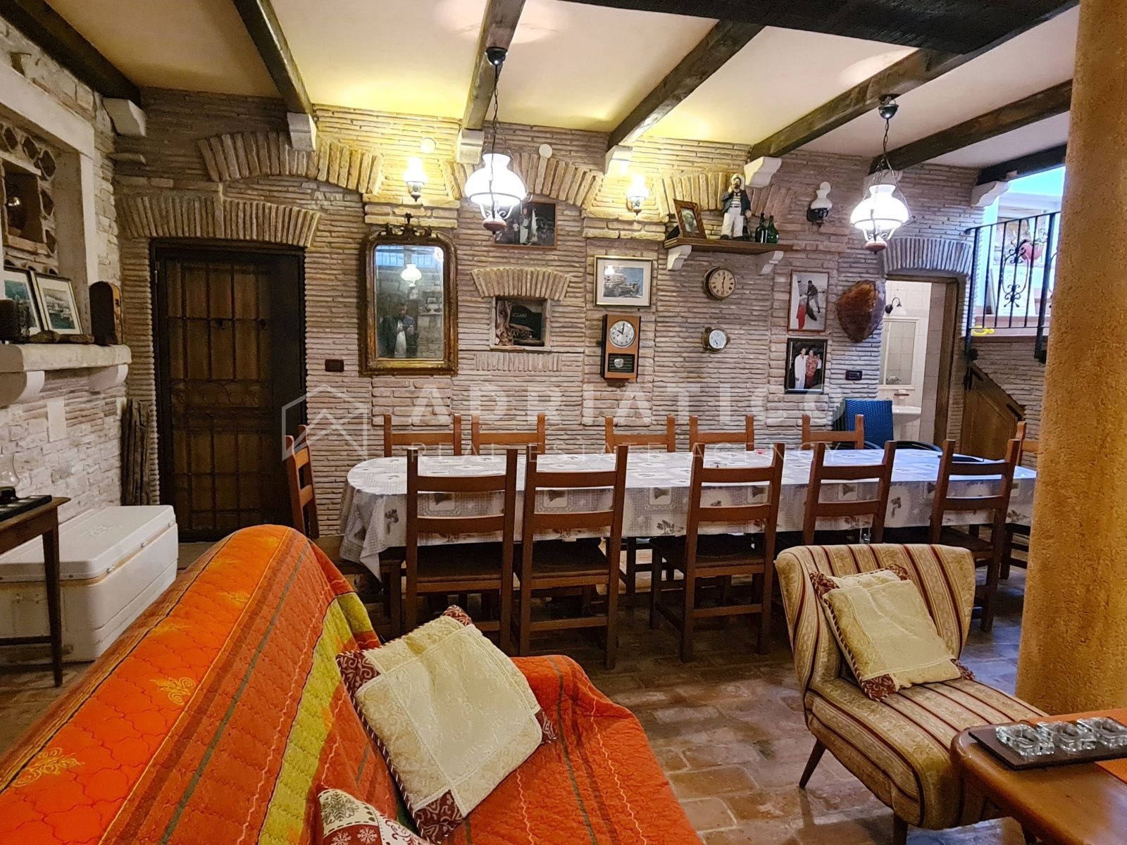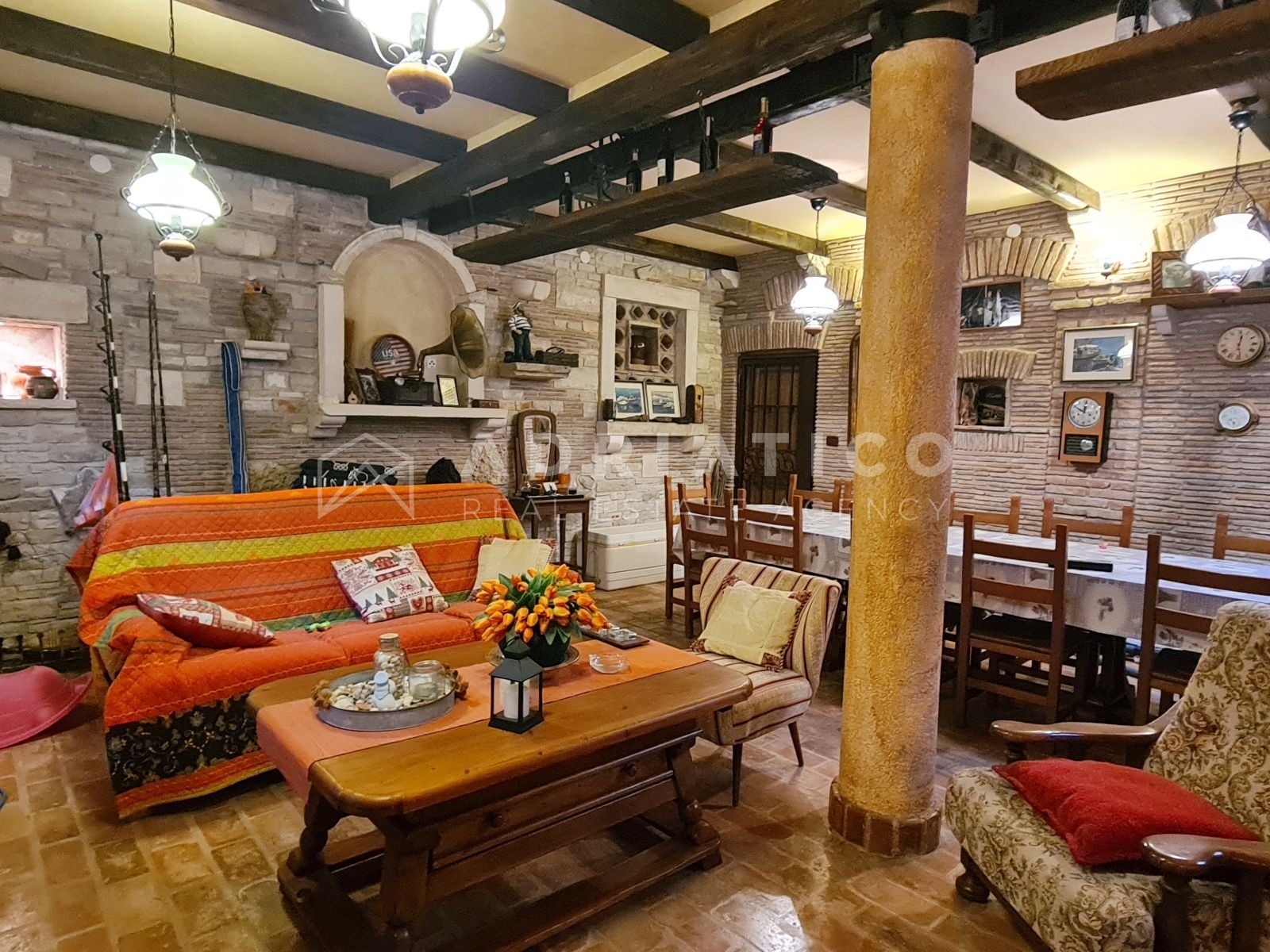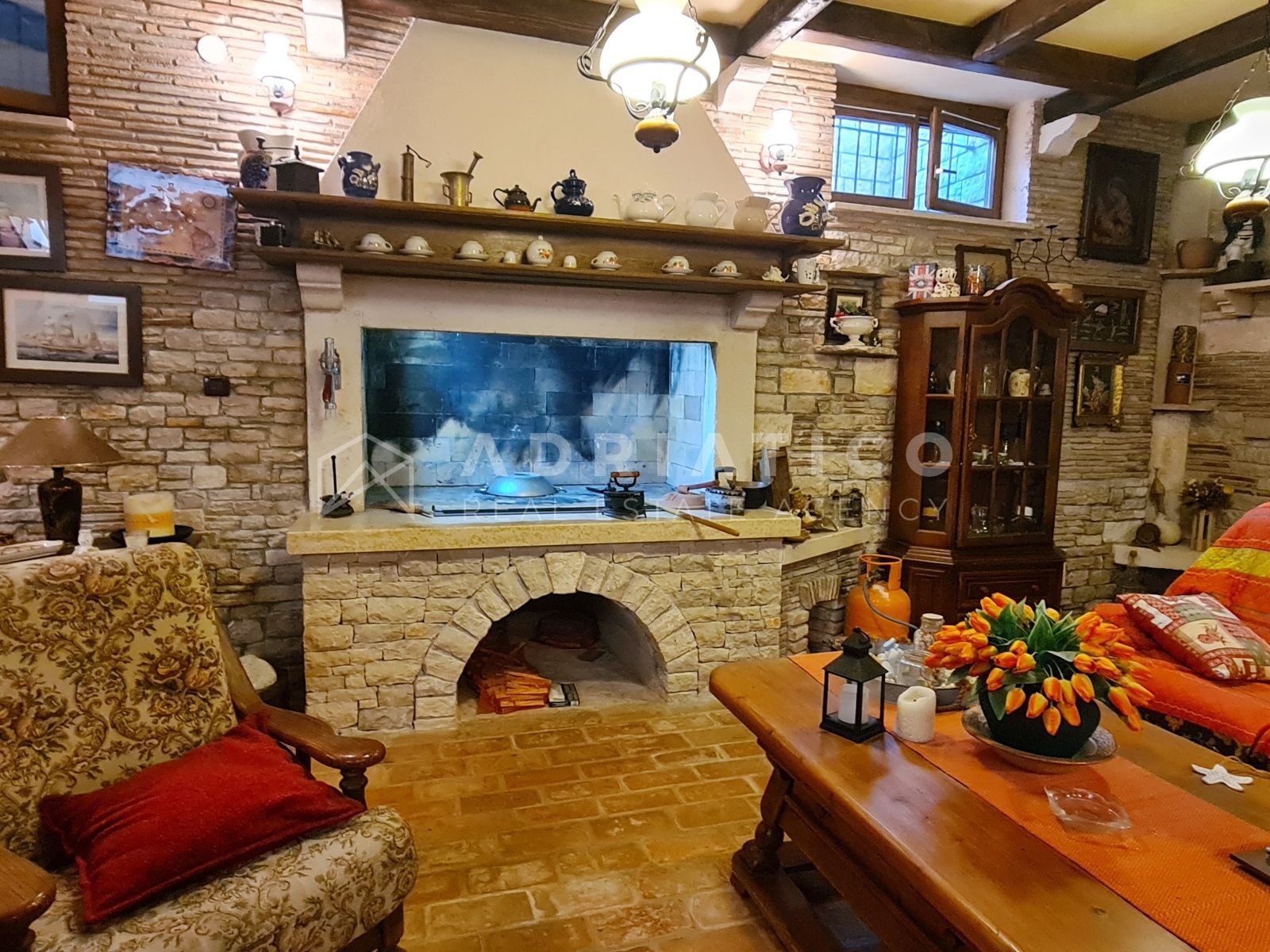 The apartment consists of a kitchen, dining and living area, bedroom, bathroom, and a covered terrace. An internal staircase leads to the basement, where there is a tavern equipped with a kitchen, dining room with a functional fireplace, living room, and bathroom.