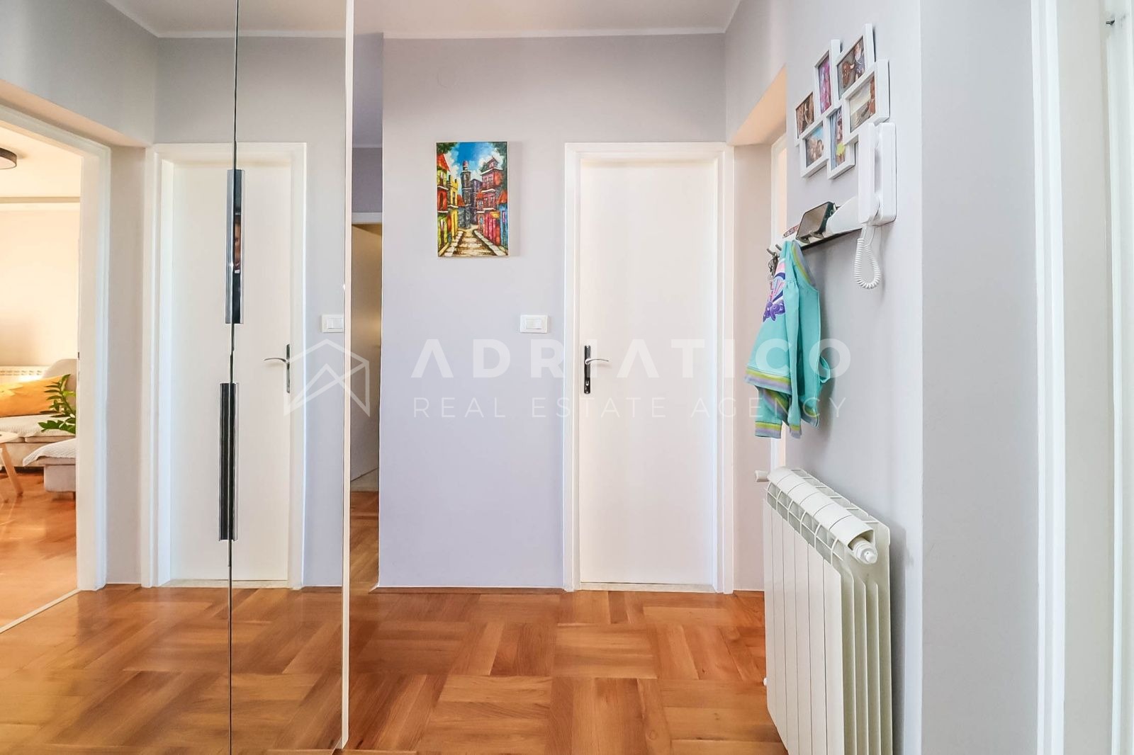 The apartment consists of an entrance hall, a spacious living room with access to a loggia, a kitchen with dining area, two bedrooms with a partial sea view and view of St. Euphemia Church, a bathroom, and a laundry room.