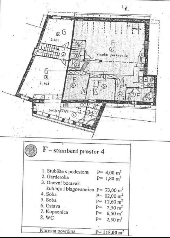 This spacious apartment, located on the second or top floor of a tipical istrian stone building, has an area of 115 m2 and consists of:
