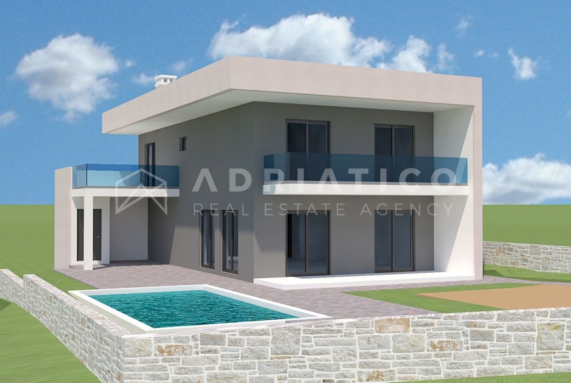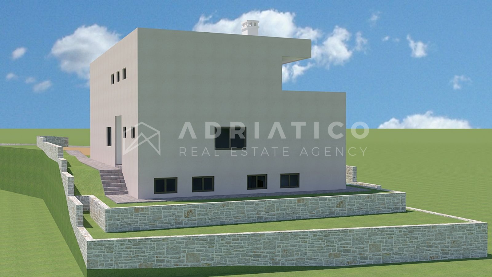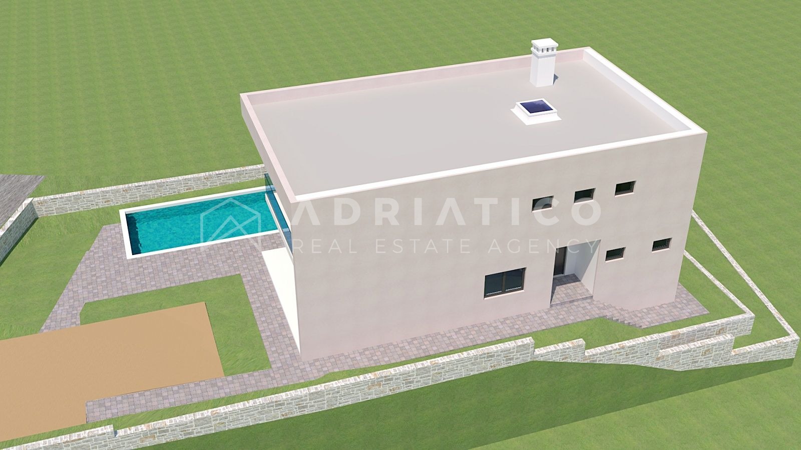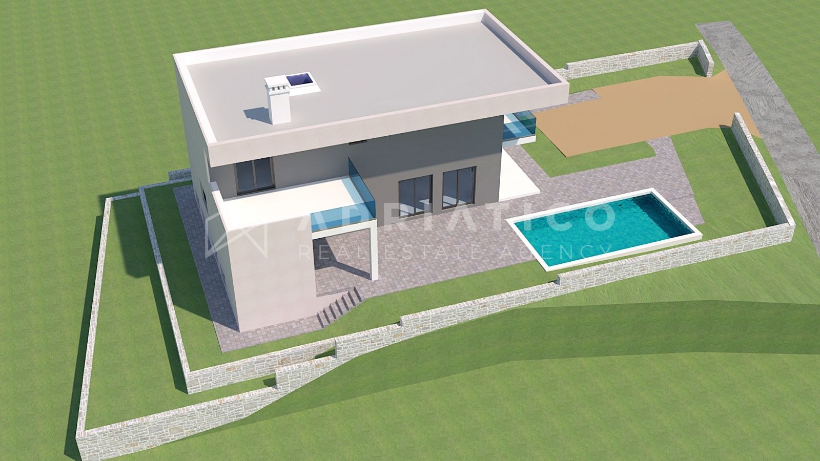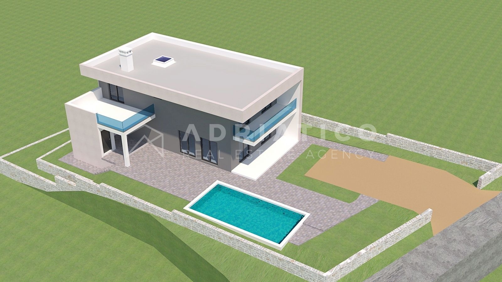 In a quiet settlement near Rovinj, this detached house in the roh bau phase is located. The house has a surface of 175 m² and comes with a garden, swimming pool, and private parking. It is roofed with a flat roof and consists of three levels: basement, ground floor, and first floor.