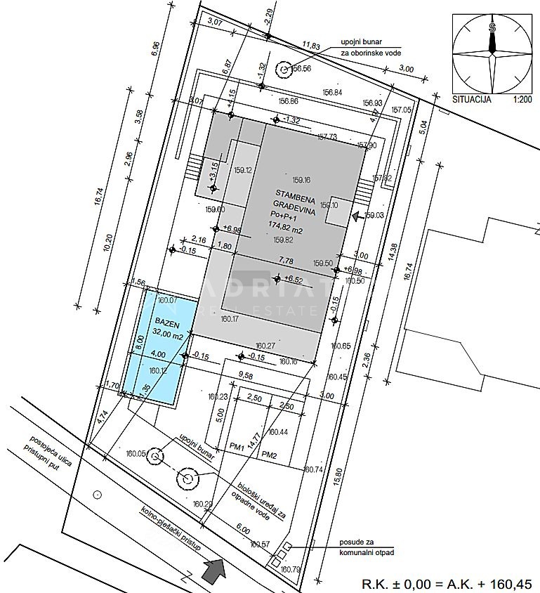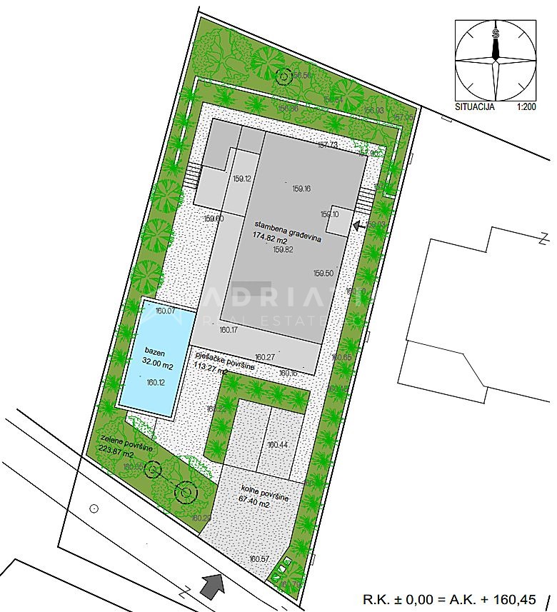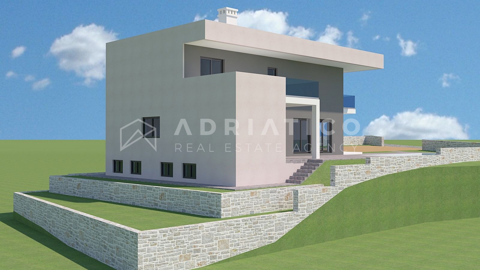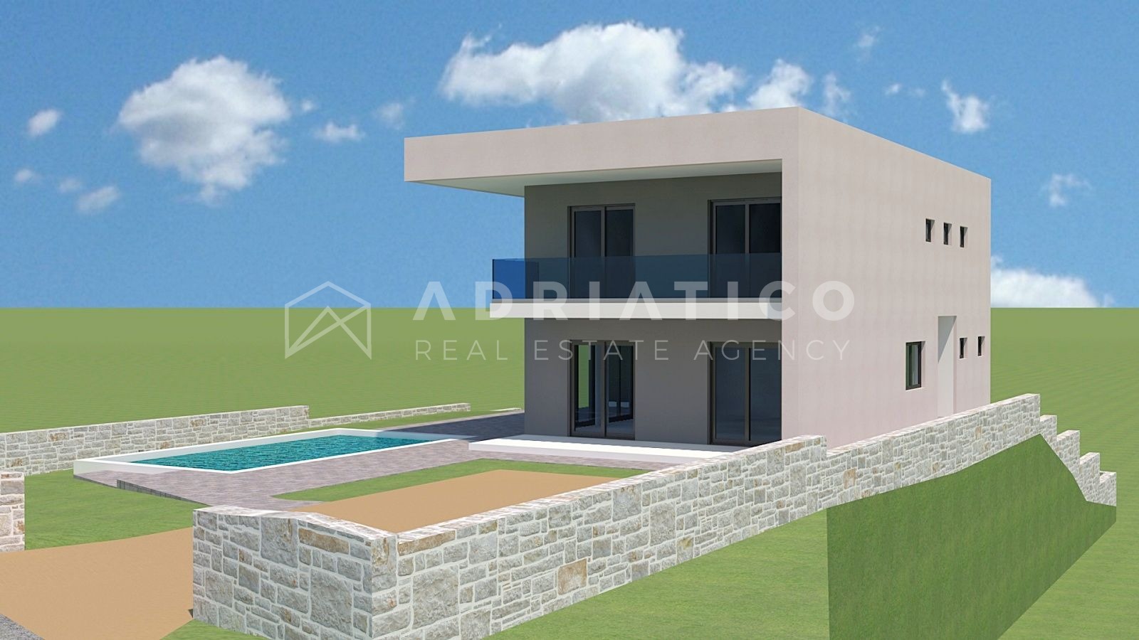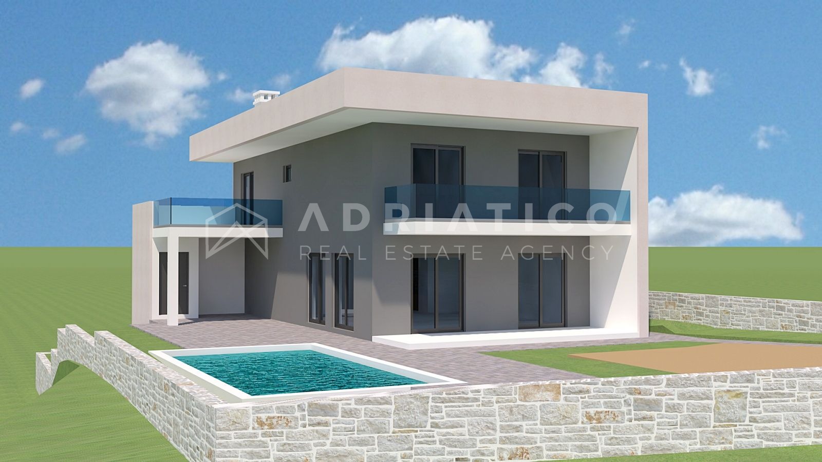In a quiet settlement near Rovinj, this detached house in the roh bau phase is located. The house has a surface of 175 m² and comes with a garden, swimming pool, and private parking. It is roofed with a flat roof and consists of three levels: basement, ground floor, and first floor.