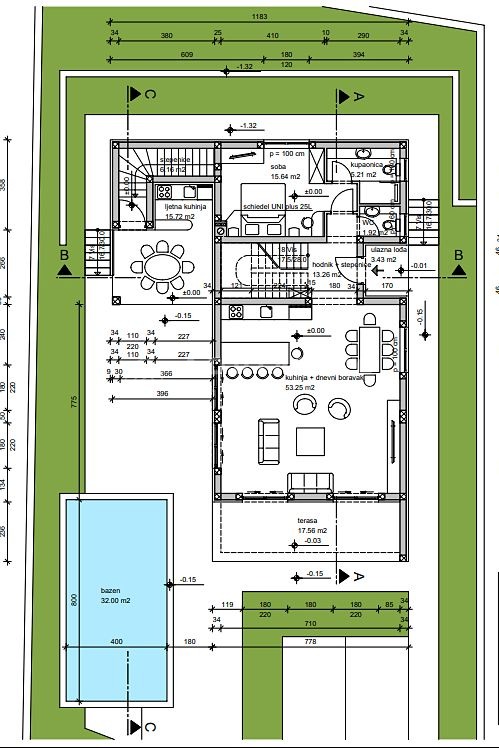 The ground floor consists of an entrance area, living room, kitchen, and dining room with access to the terrace, summer kitchen, garden, and a swimming pool (8×4 m). One bedroom with an en-suite bathroom and an additional toilet are also planned.