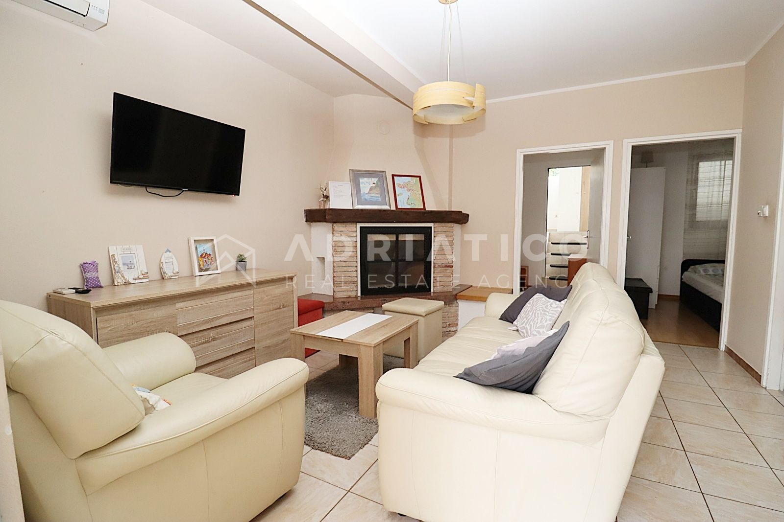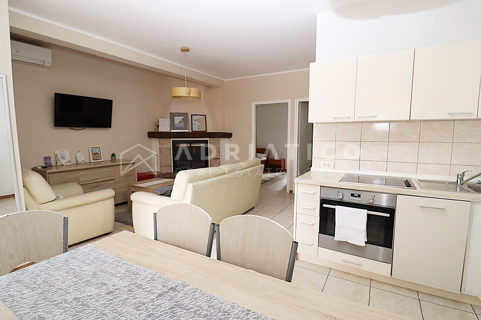 Heating and cooling are provided by an air conditioning unit, with a fireplace adding to the cozy atmosphere. The apartment features PVC windows.